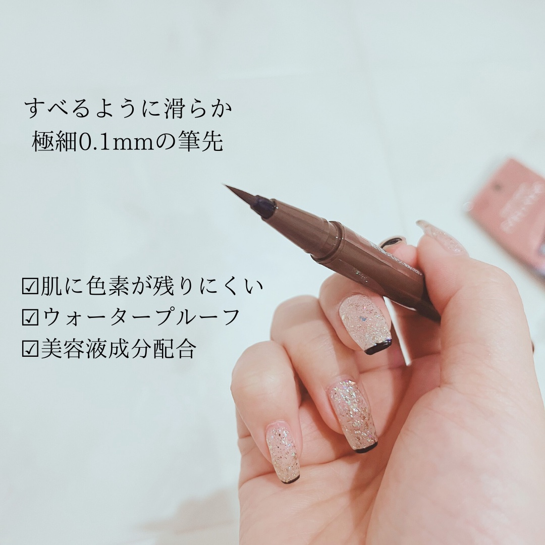 - 筆先までずっとなめらか、目尻で感動するリキッドアイライナー。 必要な量が肌にのる新設計で、まぶたの上をすべるような、滑らかな描き心地。しなやかでコシのある筆が、筆圧のコントロールを容易にし、太いラインも細いラインも思い通りに仕上げます。水、汗、涙に強いウォータープルーフタイプなのに、通常洗顔で簡単オフ。肌に色素が残らない顔料を使用。5種類の美容液成分を従来品の200%配合し、メイクしながら目元ケアまで。 ●ブラウンブラック ※2020年9月12日 バラエティショップ先行発売 ●漆黒ブラック ※2020年12月頃発売予定 ●ナチュラルブラウン ※2020年12月頃発売予定 ●シフォンブラウン 「毎日メイクに透明感と抜け感」 ブラウンでも、グレーでも、ベージュでもないニュアンスカラー。 自然な印影で素の目元を際立て、頑張りすぎない、ふんわりとした目元に。 ●アプリコットブラウン 「じゅわっと血色感。 肌に馴染むおしゃれカラー」 温かみのあるアプリコットがじゅわっと滲む血色感を目元に演出。 肌馴染みが良いので、カラーライナーに抵抗がある方もブラウンの延長線上で楽しめる、使いやすい色味です。 ”ちょっとオシャレ”な空気感を演出するカラー。 ●ピンクショコラ アイライナー 「ピンクが溶け込む濃厚ブラウン」 肌馴染みが良く、目元にじんわり血色感をプラス。 さりげなく女性らしさが加速するようなカラー。 ●ピスタチオラテ (2022年7月29日(金)発売) 「“目尻”に抜け感アクセント」 肌に馴染むのに映える絶妙なグリーン。 トレンドカラーに“くすみ”と“抜け感”をプラスしたまろやかな発色。 ●マスタードブラウン 「“イエロー”が揺れる、大人の洒落色」 (2022年7月29日(金)発売) まるで太陽のような暖かさを感じる新しいブラウン。 ほんのり感じるイエローでメイクが一気に垢抜ける稀有な色。 ●シフォンピンク(2023年2月10日発売) 「ふんわり柔らか"まろみピンク"」 甘くなりすぎない青みニュアンスで目元の透明感UP。 目元を引き締め、ピンクメイクにありがちな腫れぼったさを解消。 ●ミルクカプチーノ(2023年4月21日発売) まろやかな深みの“優しい締め色” どんなメイクにも合わせやすいカラー。 自然な陰影でさりげなく目幅を拡張します。 ●グレーカシミア(2023年10月1日発売) ブラウンがほんのり溶け込んだ、暖色グレー まろやかな発色で、パーソナルカラーを問わず肌に馴染む 目元の陰影になりすまし、抜け感と目力を欲張りに叶える ●ダークフィグ(2024年6月1日発売) するする”なめらか。描きやすいのに、落ちにくい。 クッキリ可愛いほの甘ダークブラウン ●ピーチモカ(2024年8月1日発売) ふわっと自然に盛れる“桃色ブラウン” ほんのり血色感で目元にうるみ感を演出 ●スターダストブラウン(2024年12月11日発売) キラッと繊細に輝く''星屑ブラウン'' 透け感のあるダークブラウンの色味とラメの輝きが、目元に艶のある立体感を演出 ●チャコールモカ(2025年4月10日発売) 目元を締める''深みグレージュ'' 黄みや赤みに偏りすぎない絶妙な色設計で、自然に目元を強調