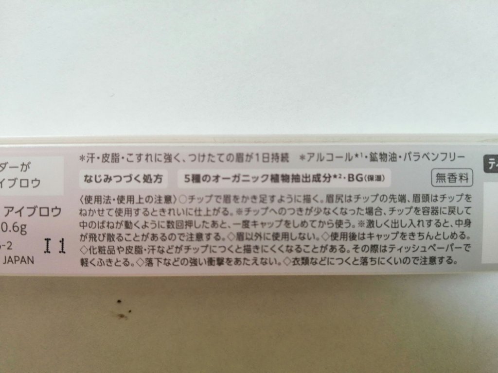 - 水・合成金雲母・BG・アクリレーツクロスポリマー-2-Na・カミツレ花エキス・セイヨウハッカ葉エキス・トウキンセンカ花エキス・トコフェロール・ラベンダー花エキス・ローズマリー葉エキス・PVP・イソステアリン酸PEG-60グリセリル・シリカ・ジメチコン・ベヘネス-30・メタリン酸Na・デヒドロ酢酸Na・フェノキシエタノール・カーボンブラック・酸化チタン・酸化鉄・黄4
