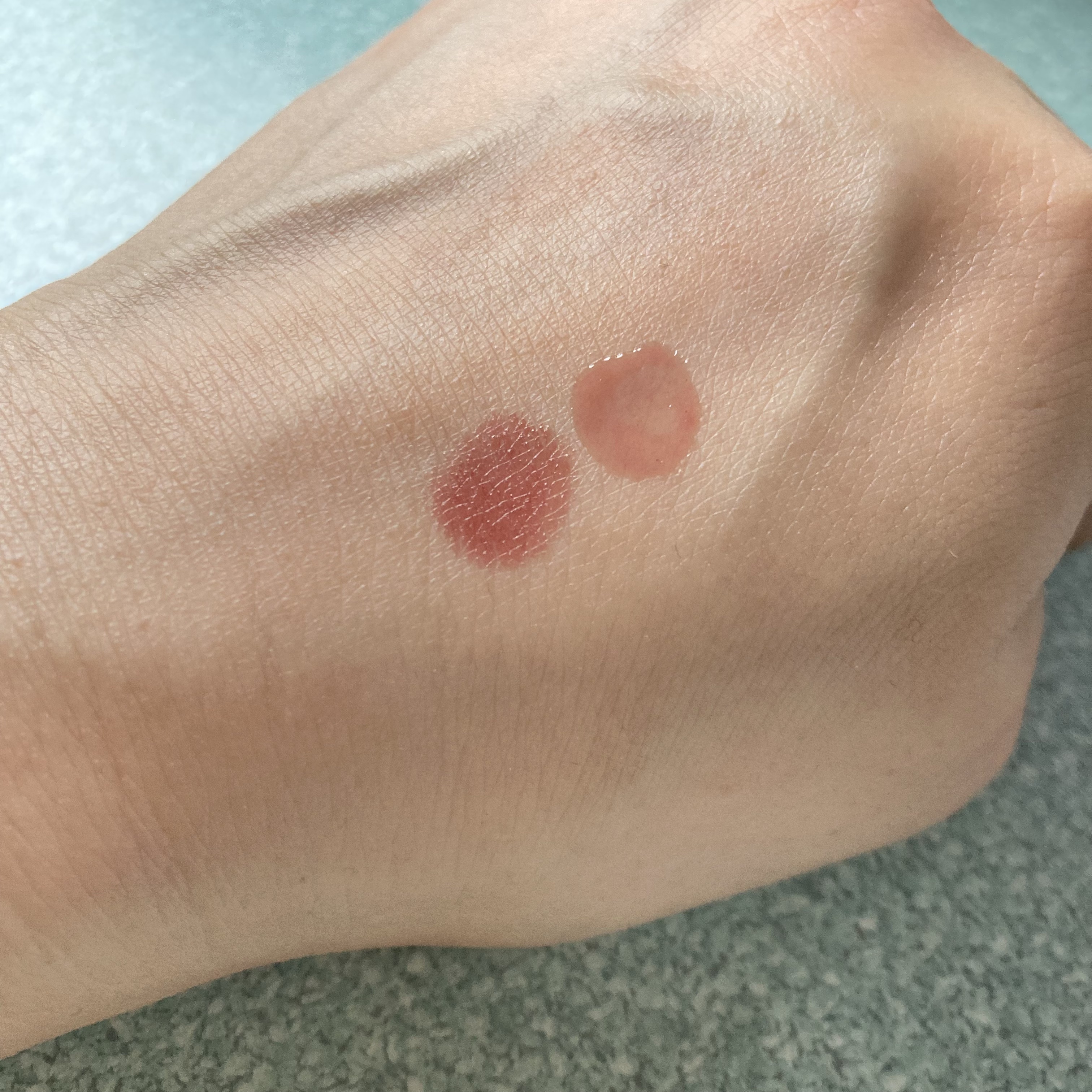 ぜっんぜっん乾燥しないんですね! びっくりしました(笑)。 唇の色が濃いので、そのままつけると少しオレンジっぽい発色に。 ティントリップの使い方に忠実に、コンシーラーで唇の色を消してから使ってみると、濃いめのピンクに発色しました。 3分後ティッシュオフすると少し色落ちしました。 マスクしていて外した時に少し落ちていても、許容範囲かな?と思いました。 クレンジングだけだと少し色が残ってましたが、ダブルクレンジングをするとちゃんと落ちました。