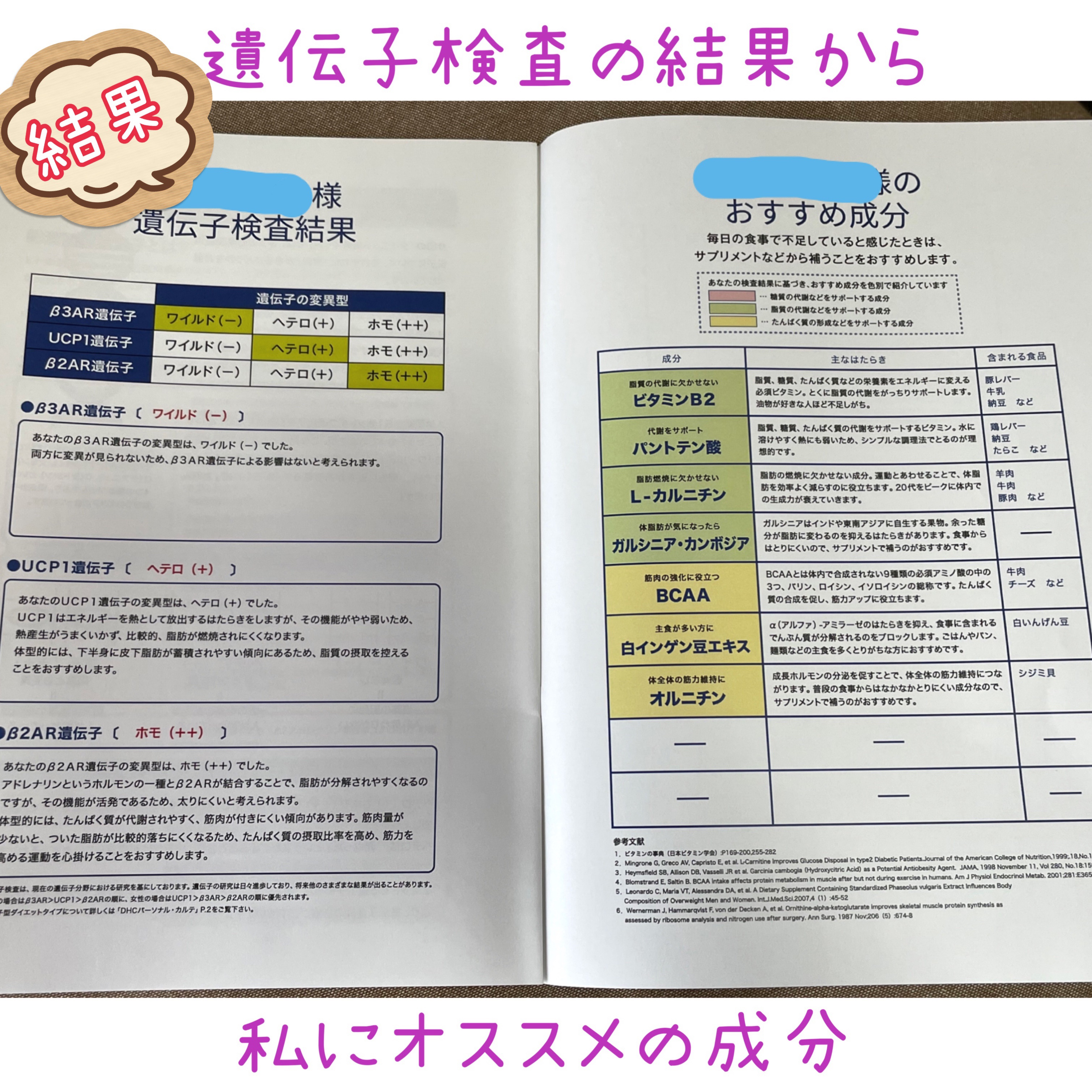 まず、採取棒で口の中の頬部分を擦ります。 1ヶ月もしないで結果が家に届きます👏🏻(あらかじめWEB登録をするとスマホで結果が先に見れます) りんご型、バナナ型、洋ナシ型、アダム・イヴ型の4種類の型に分類されます。 また、肥満遺伝子であるβ3AR遺伝子、UCP1遺伝子、β2AR遺伝子のワイルド(-)、ヘテロ(+)、ホモ(++)によりさらに分類されます🧬 これにより、その人によって毎日の食事でなにが不足しているのか、何を控えるべきか、運動メニューやエクササイズまで分かります🌟 また、その人に合ったビタミン剤の案内まで👏🏻 実際にダイエットを初めて、少しずつですが体重が落ちてきたそうです☺️