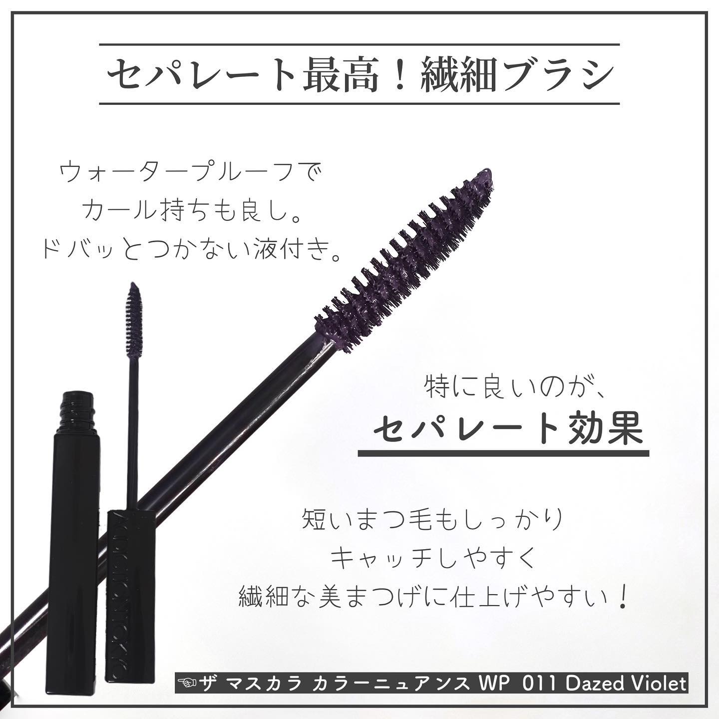 - 繊細な色彩のニュアンスを目元に宿す“色感マスカラ”。 細く短いまつ毛も発掘するブラシで1本1本ていねいに彩れば、 すっと吸い込まれそうな透明感のある神秘的な眼差しへ。 軽やかで濃密なまつ毛に仕上げ、美しいカールが持続する、ウォータープルーフタイプ。