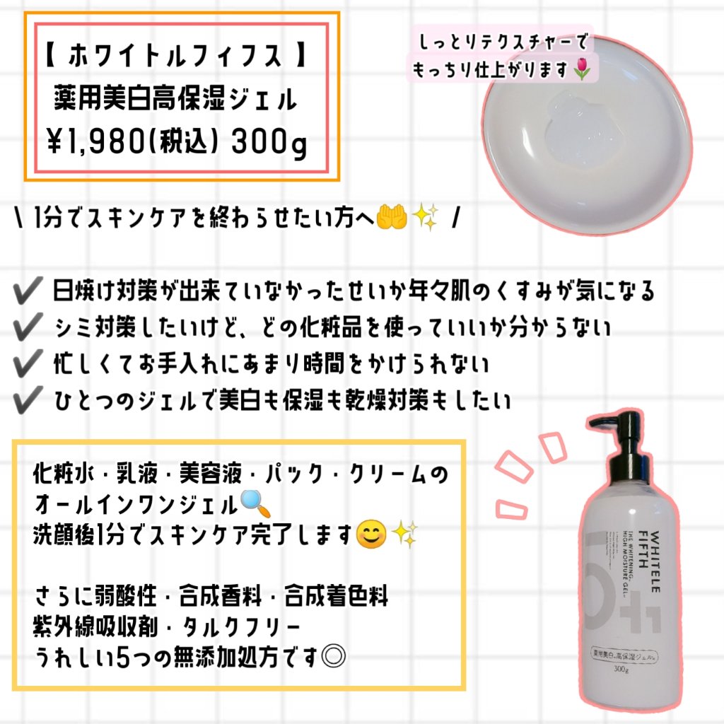 WHITELEFIFTH薬用美白高保湿ジェルこれ1つでスキンケア完了のオールインワンジェルPoint1美白有効成分プラセンタエキス配合で美白ケアでしみ、そばかすを増やさない【プラセンタエキスの3つの役割】・メラニンの生成抑制・メラニンの排泄促...