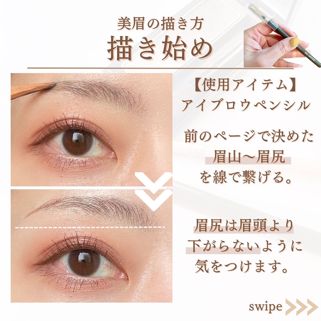 外枠を囲む わざとらしく貼り付けたような眉に…! 眉毛は1本1本毛を描くようにして描いてくださいね🙌💫 眉頭から描く 眉頭が濃くなってしまい、きつく強い印象に。 眉山から描き始めると濃さのバランスが取りやすくてオススメです☺️✨ ペン先を持って描く 筆圧が強くなり、濃い眉毛の原因に。 更に皮膚に摩擦も生じやすいので注意です🙅♀️ ペンは真ん中あたりをふんわりと持って描いてくださいね✍️