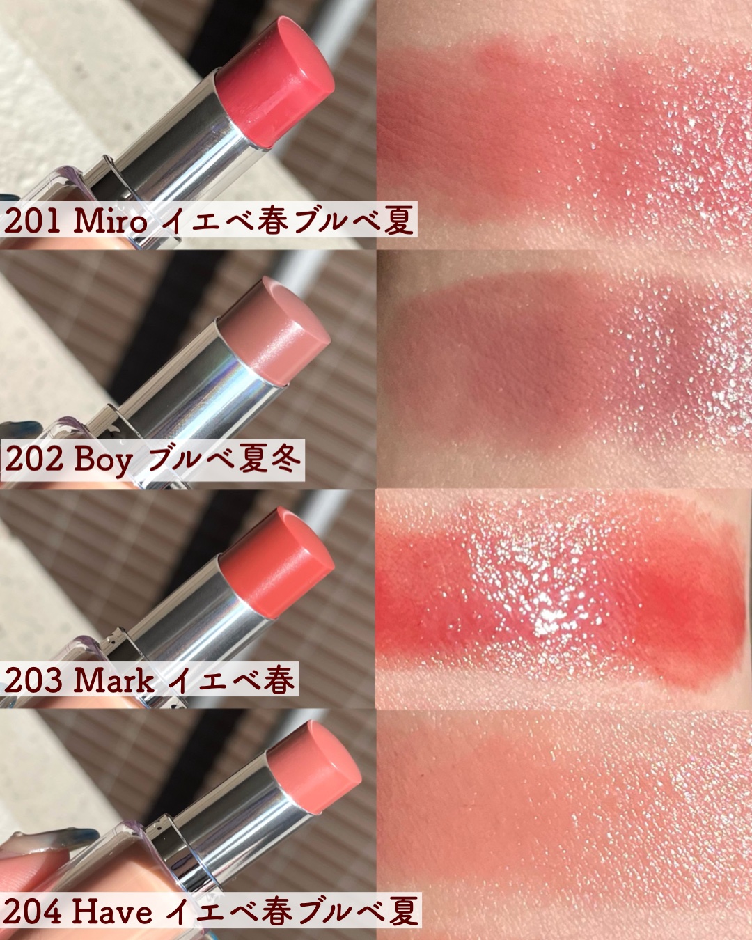 - <201 ミロ> ( アジピン酸/カプリン酸/カプリル酸/ヘプタン酸)ペンタエリスリチル、リンゴ酸ジイソステアリル、ダイマージリノール酸ダイマージリノレイルビス(ベヘニル/イソステアリル/フィトステリル)、オクチルドデカノール、合成ワックス、ポリイソブテン、トリメリト酸トリトリデシル、水添ポリイソブテン、トリイソステアリン酸ポリグリセリル-2、ジイソステアリン酸ダイマージリノレイル、マイクロクリスタリンワックス、セスキオレイン酸ソルビタン(小麦由来)、ポリヒドロキシステアリン酸、ジメチルシリル化シリカ、酢酸トコフェロール、パルミチン酸エチルヘキシル、レシチン、ミリスチン酸イソプロピル、イソステアリン酸、ジメチコン、ポリリシノレイン酸ポリグリセリル-3、デヒドロ酢酸、香料、(チタン/酸化チタン)焼結物、トコフェロール、酸化チタン、黄4、赤202、酸化鉄、橙201、紫201 <202 ボーイ> ( アジピン酸/カプリン酸/カプリル酸/ヘプタン酸)ペンタエリスリチル、リンゴ酸ジイソステアリル、ダイマージリノール酸ダイマージリノレイルビス(ベヘニル/イソステアリル/フィトステリル)、オクチルドデカノール、合成ワックス、ポリイソブテン、トリイソステアリン酸ポリグリセリル-2、トリメリト酸トリトリデシル、水添ポリイソブテン、マイクロクリスタリンワックス、ジイソステアリン酸ダイマージリノレイル、セスキオレイン酸ソルビタン(小麦由来)、ポリヒドロキシステアリン酸、ジメチルシリル化シリカ、酢酸トコフェロール、ミリスチン酸イソプロピル、イソステアリン酸、パルミチン酸エチルヘキシル、レシチン、ジメチコン、ポリリシノレイン酸ポリグリセリル-3、デヒドロ酢酸、硫酸Ba、香料、アラビアゴム、ウコン根エキス、マルトデキストリン、ロジン、トコフェロール、酸化チタン、黄4、赤201、酸化鉄、紫201、赤202、赤223 <203 マーク> ( アジピン酸/カプリン酸/カプリル酸/ヘプタン酸)ペンタエリスリチル、リンゴ酸ジイソステアリル、ダイマージリノール酸ダイマージリノレイルビス(ベヘニル/イソステアリル/フィトステリル)、オクチルドデカノール、合成ワックス、ポリイソブテン、トリメリト酸トリトリデシル、水添ポリイソブテン、トリイソステアリン酸ポリグリセリル-2、ジイソステアリン酸ダイマージリノレイル、マイクロクリスタリンワックス、セスキオレイン酸ソルビタン(小麦由来)、ポリヒドロキシステアリン酸、ジメチルシリル化シリカ、酢酸トコフェロール、硫酸Ba、パルミチン酸エチルヘキシル、レシチン、イソステアリン酸、ミリスチン酸イソプロピル、(チタン/酸化チタン)焼結物、ジメチコン、ポリリシノレイン酸ポリグリセリル-3、デヒドロ酢酸、香料、ロジン、アラビアゴム、ウコン根エキス、マルトデキストリン、トコフェロール、酸化チタン、黄4、酸化鉄、赤202、赤201、橙201、赤223 <204 ハヴ> ( アジピン酸/カプリン酸/カプリル酸/ヘプタン酸)ペンタエリスリチル、リンゴ酸ジイソステアリル、ダイマージリノール酸ダイマージリノレイルビス(ベヘニル/イソステアリル/フィトステリル)、オクチルドデカノール、合成ワックス、ポリイソブテン、トリイソステアリン酸ポリグリセリル-2、トリメリト酸トリトリデシル、水添ポリイソブテン、ジイソステアリン酸ダイマージリノレイル、マイクロクリスタリンワックス、セスキオレイン酸ソルビタン(小麦由来)、ポリヒドロキシステアリン酸、ジメチルシリル化シリカ、酢酸トコフェロール、ミリスチン酸イソプロピル、パルミチン酸エチルヘキシル、レシチン、イソステアリン酸、硫酸Ba、ジメチコン、(チタン/酸化チタン)焼結物、ポリリシノレイン酸ポリグリセリル-3、デヒドロ酢酸、香料、ロジン、トコフェロール、酸化チタン、黄4、酸化鉄、赤202、赤218 <205 マルド> ( アジピン酸/カプリン酸/カプリル酸/ヘプタン酸)ペンタエリスリチル、リンゴ酸ジイソステアリル、ダイマージリノール酸ダイマージリノレイルビス(ベヘニル/イソステアリル/フィトステリル)、オクチルドデカノール、合成ワックス、ポリイソブテン、トリメリト酸トリトリデシル、水添ポリイソブテン、トリイソステアリン酸ポリグリセリル-2、ジイソステアリン酸ダイマージリノレイル、マイクロクリスタリンワックス、セスキオレイン酸ソルビタン(小麦由来)、ポリヒドロキシステアリン酸、ジメチルシリル化シリカ、酢酸トコフェロール、パルミチン酸エチルヘキシル、イソステアリン酸、レシチン、ミリスチン酸イソプロピル、ジメチコン、ポリリシノレイン酸ポリグリセリル-3、デヒドロ酢酸、(チタン/酸化チタン)焼結物、香料、アラビアゴム、ウコン根エキス、マルトデキストリン、トコフェロール、酸化チタン、黄4、酸化鉄、赤202、赤201、橙201、赤223 <206 リリー> ( アジピン酸/カプリン酸/カプリル酸/ヘプタン酸)ペンタエリスリチル、リンゴ酸ジイソステアリル、ダイマージリノール酸ダイマージリノレイルビス(ベ