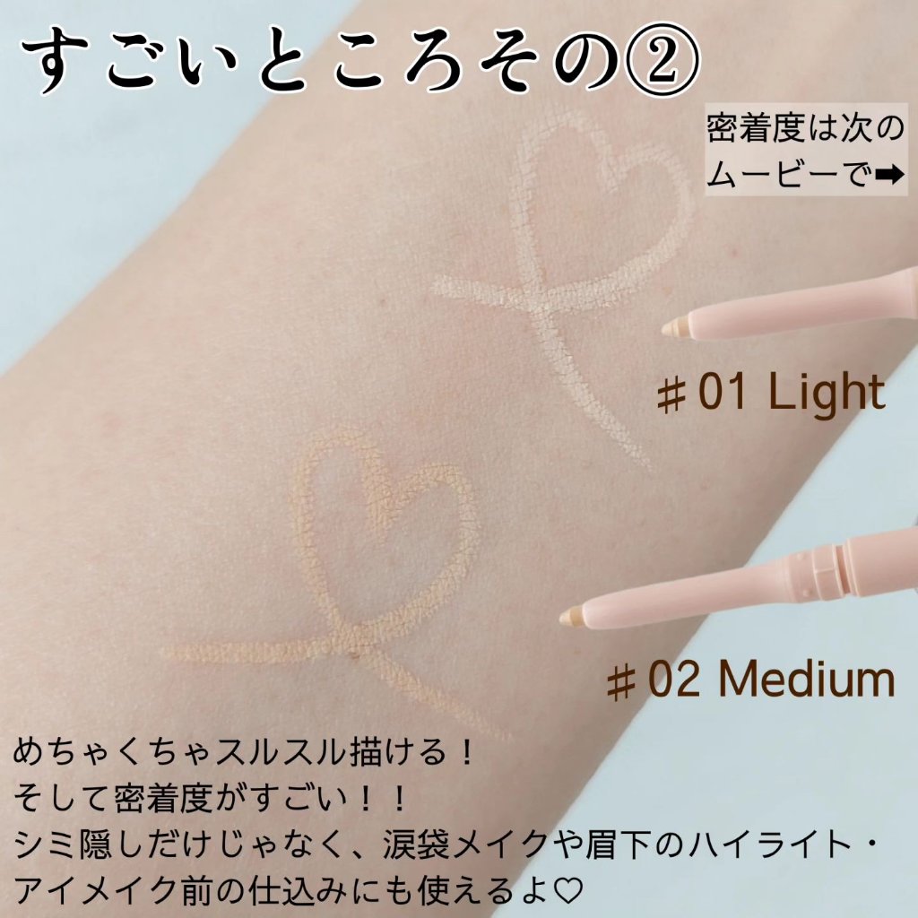 - 軽く密着ししっかりと固定させるもっちりとしたテクスチャのソフトマットコンシーラーペンシル。 肌にスムーズになじみ、皮膜を形成して密着、固定。ウォータープルーフ機能で長時間持続。 シミカバー*、涙袋メイク、眉毛メイクなどに使用可能。シャープナー内蔵。 *メイクアップ効果による