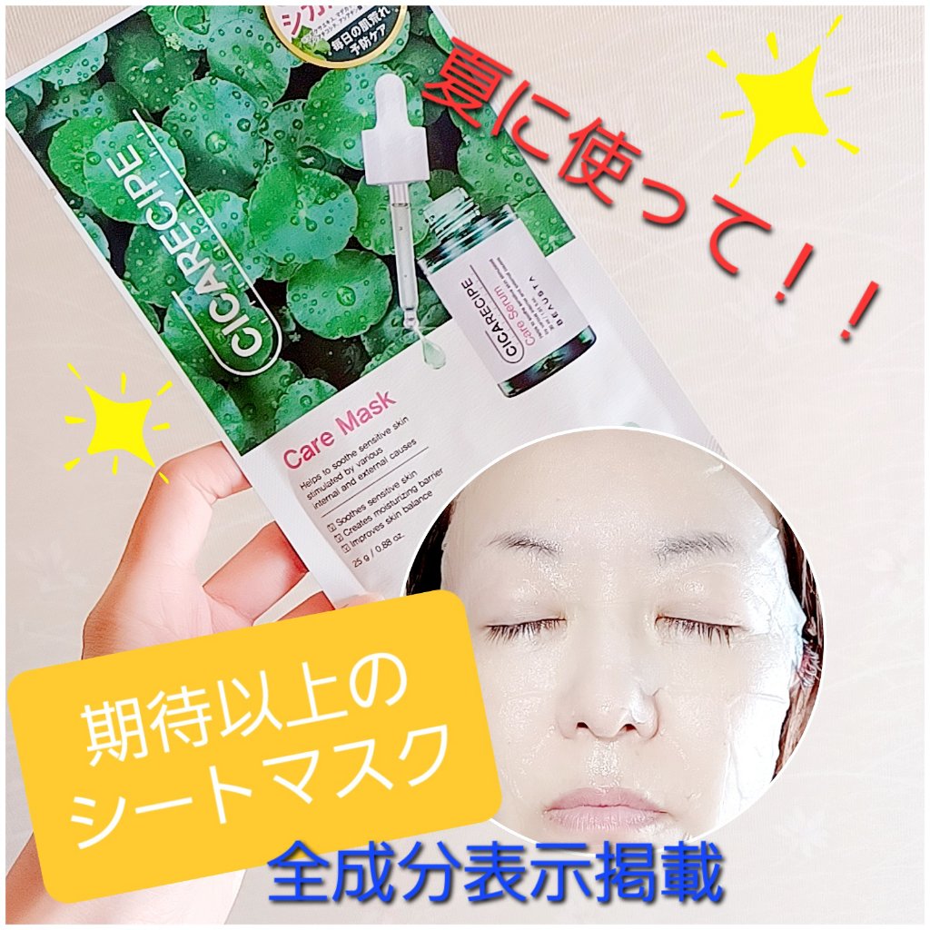 - <1枚> 水、BG、グリセリン、ヒアルロン酸Na、カルボマー、香料、ホホバ種子油、アルギニン、カプリリルグリコール、エチルヘキシルグリセリン、ツボクサエキス、DPG、カミツレ花エキス、水添レシチン、ヒドロキシエチルセルロース、セラミドNP、PEG-60水添ヒマシ油、ベルガモット果実油、デキストリン、パンテノール、1,2-ヘキサンジオール、アラントイン、EDTA-2Na、クチナシ果実エキス、マデカッソシド、スフィンゴ糖脂質、β-グルカン、アシアチコシド、マデカシン酸、アシアチン酸、コチニールサボテン果実エキス