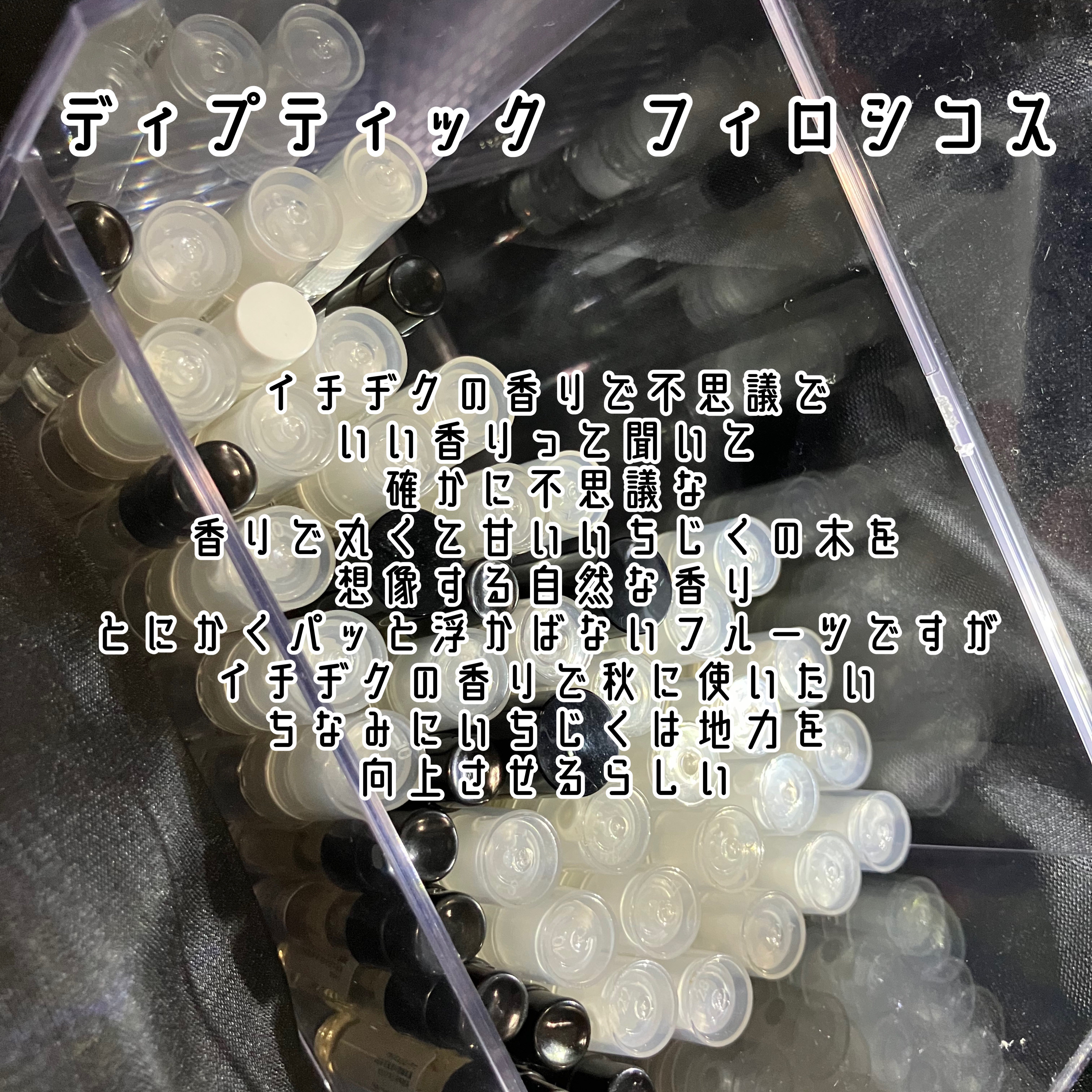甘ずっぱくてみずみずしいイチジクの香り。ディプティックのイチジクをイメージした香り、Philosykos(フィロシコス)。ギリシャ語で「イチジクの友」という意味らしいです。 甘すぎず、フルーティー過ぎない、なかなか人と被らない香りで、年中通して爽やかにつけれます。 販売員のお兄さんいわく、高級ホテルのアメニティにも採用されている香りだそうです。