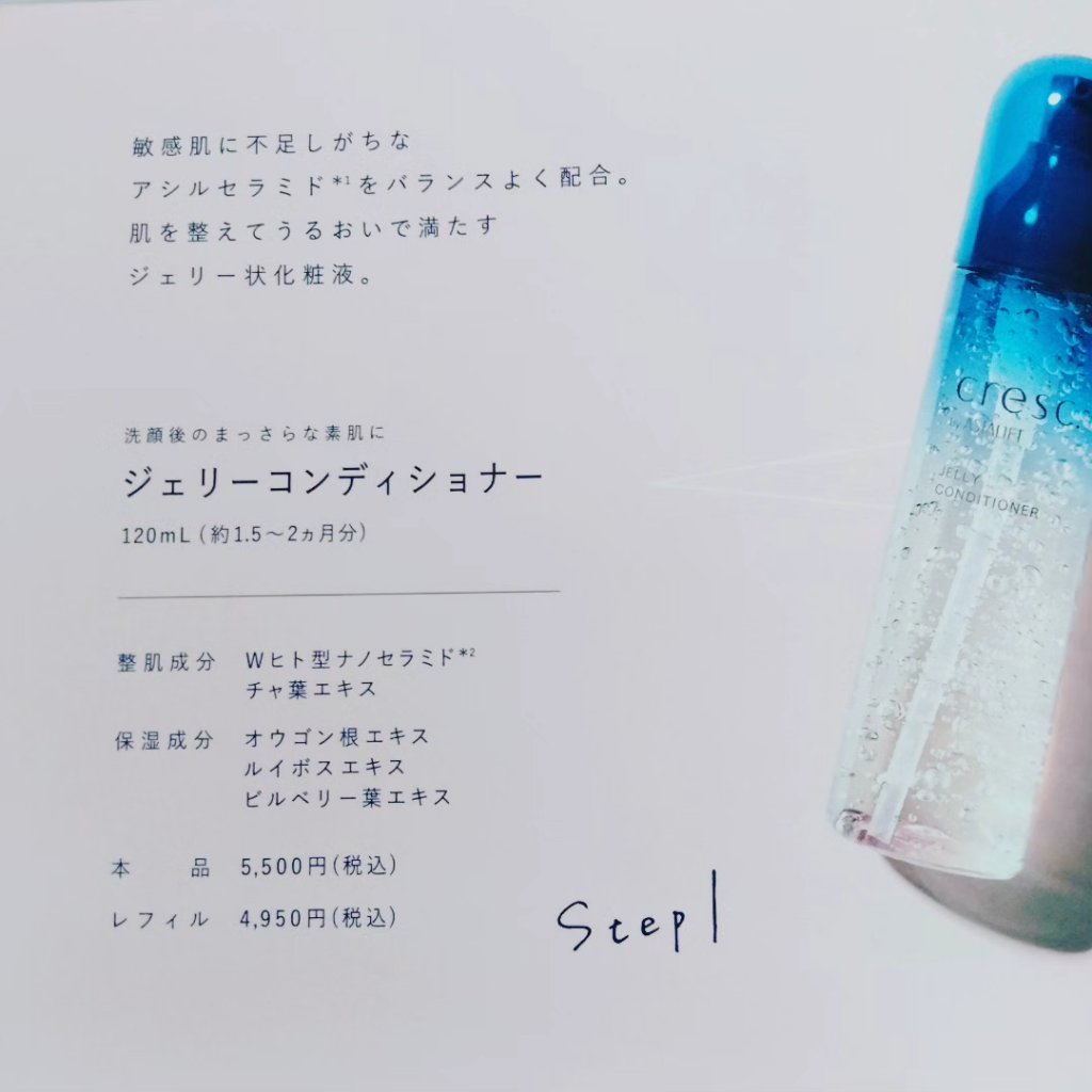 洗顔後のまっさらな素肌に。肌を整えてうるおいで満たすジェリー状化粧液。Wヒト型ナノセラミドとチャ葉エキスが肌をうるおいで満たします。 テクスチャはみずみずしいジェリー状。なのに肌に乗せると伸びが良くてすっとなじんでいきます。ベタつき感もまったくなし! フジフイルムの技術により、ナノ化したセラミドで角層までうるおしてくれるんだとか。 Wのセラミドケアでセラミドをブックエンドのように固定してくれるというのが印象的でした。