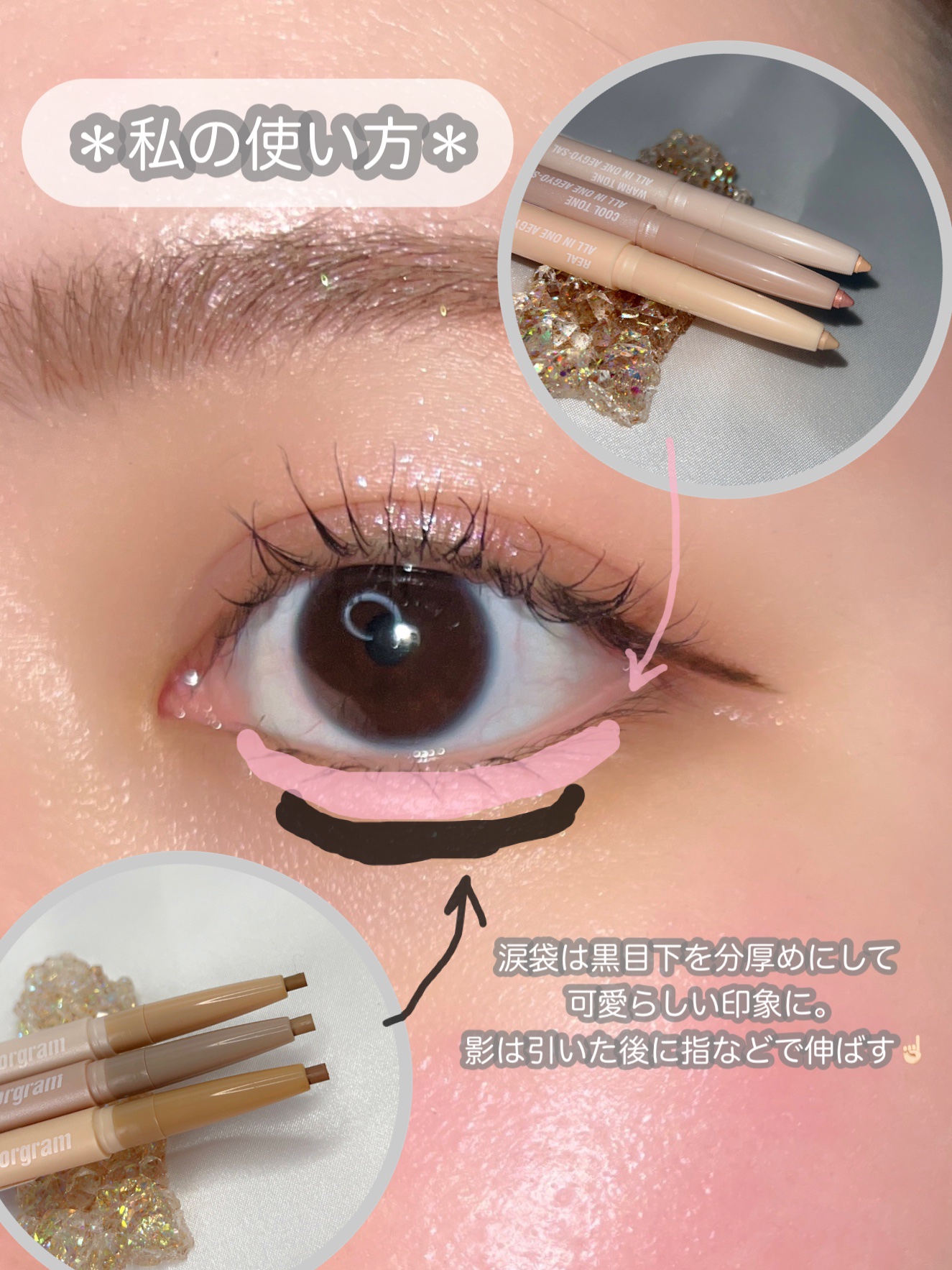 - 1.2色で簡単 涙袋メイク完成 陰影ライナーで涙袋の影をサッと描いて 反対側のカラーシャドウで涙袋全体を埋めるだけで、 生まれつきの涙袋*のように ぷっくり*自然な仕上がりに! 2. 粉飛びを防いでなめらかフィット 1回でスムーズに描ける柔らかい密着テクスチャー ムラになりにくくヨレにくい、簡単にブレンディングできる クリームフォーミュラ 3. 描きやすい細芯タイプ 狭くて細い部位にも繊細なタッチでメイクが完成! 涙袋メイクに特化した #超繊細サイズ *メイクアップ効果による