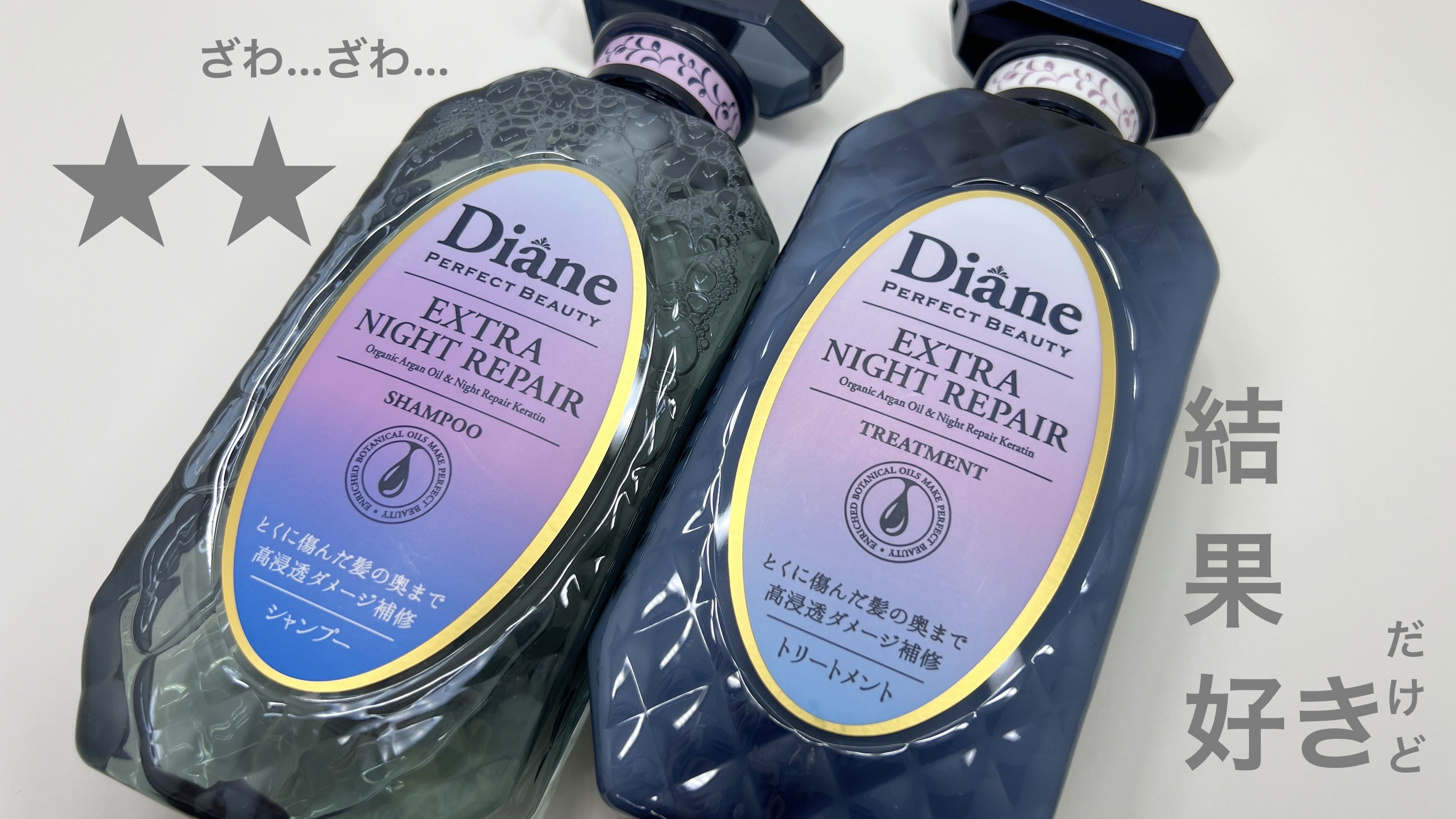 ダイアンパーフェクトビューティー エクストラナイトリペア シャンプー トリートメント 450mlセットで1,000円くらいで購入!!シャンプーは緩め。すすぐとき指通らんくらいつるっつるのキッシキシ😳トリートメントするとマシになるけど...ド...