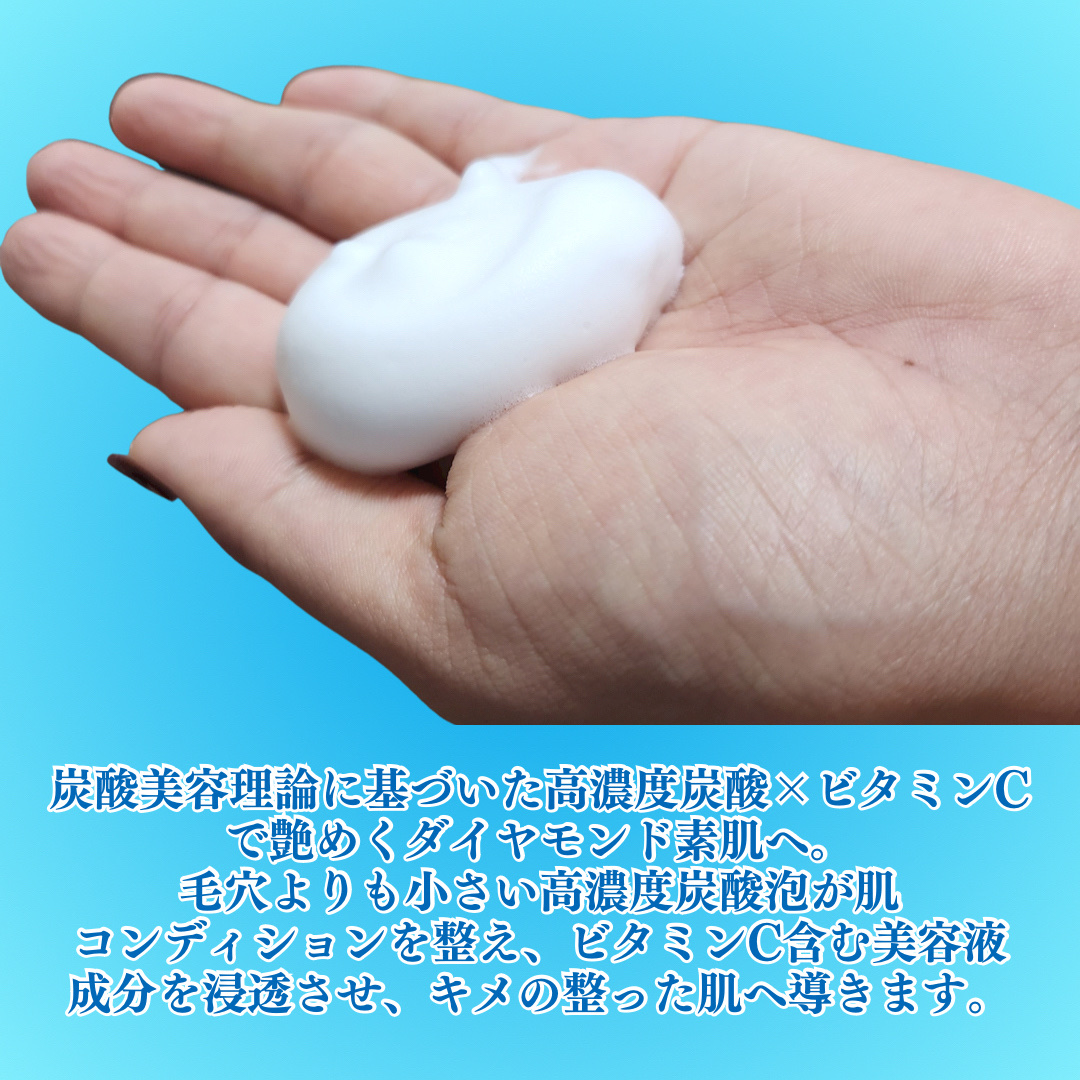 - 炭酸美容理論に基づいた高濃度※1 炭酸※2 ×ビタミンC※3 で艶めくダイヤモンド素肌へ。毛穴よりも小さい高濃度炭酸※1 泡が肌コンディションを整え、ビタミンC※3 含む美容液成分※4 を角質層まで浸透させ、キメの整った肌へ導く。 ※1 自社基準による炭酸濃度 ※2 炭酸ガス(噴射剤) ※3 アスコルビン酸(整肌成分) ※4 加水分解コラーゲン、ヒアルロンNa、グルコシルセラミド、アスコビルグルコシド(全て保湿成分)