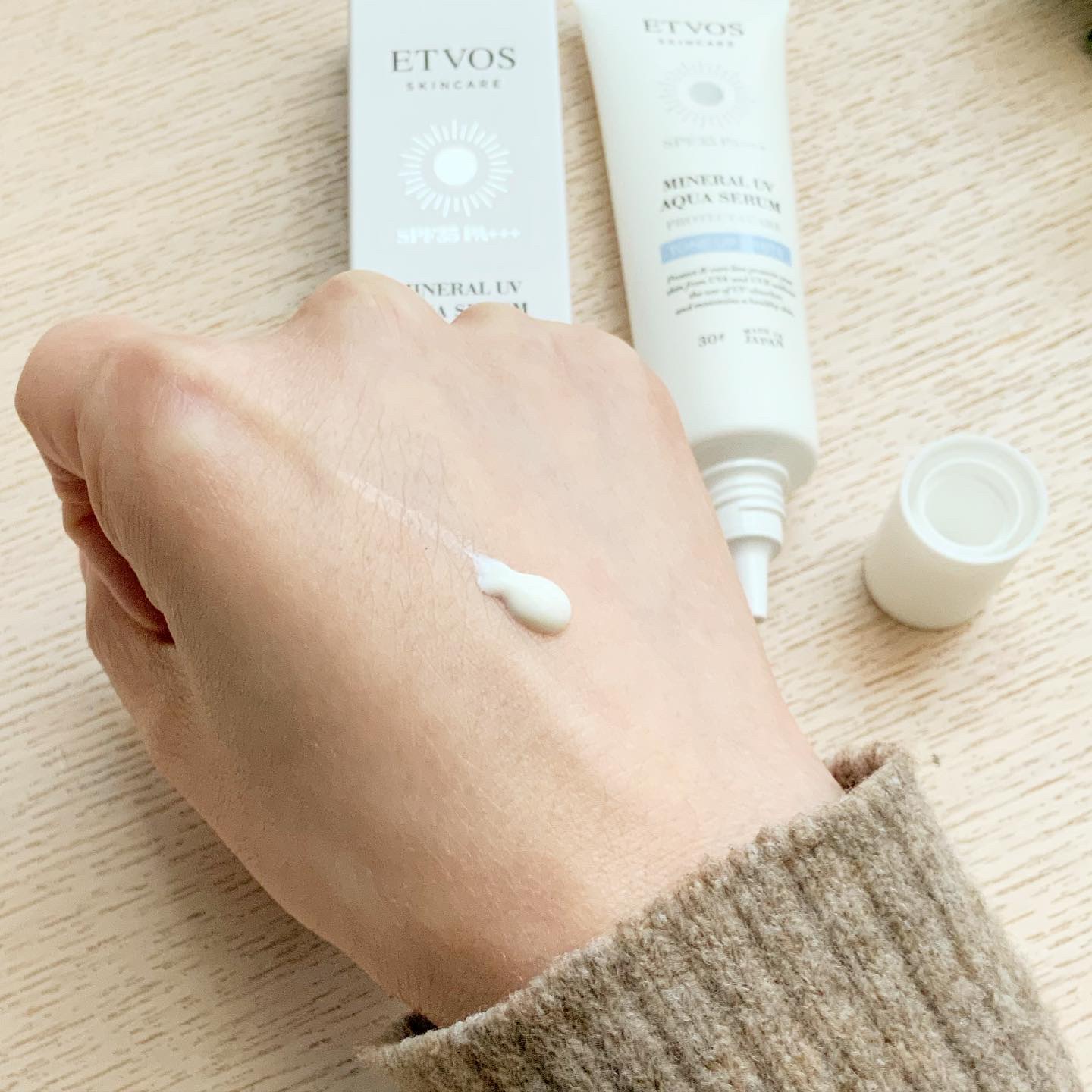日焼け止め・美容液・化粧下地の3つの機能が備わった多機能美容液「ミネラルUVアクアセラム」 みずみずしいテクスチャー🫧 美容液のような感覚で塗れて日焼け止めをは思えないほど軽い! SPF35、PA+++の紫外線カット効果で十分だし、石鹸でオフできるのが嬉しい!