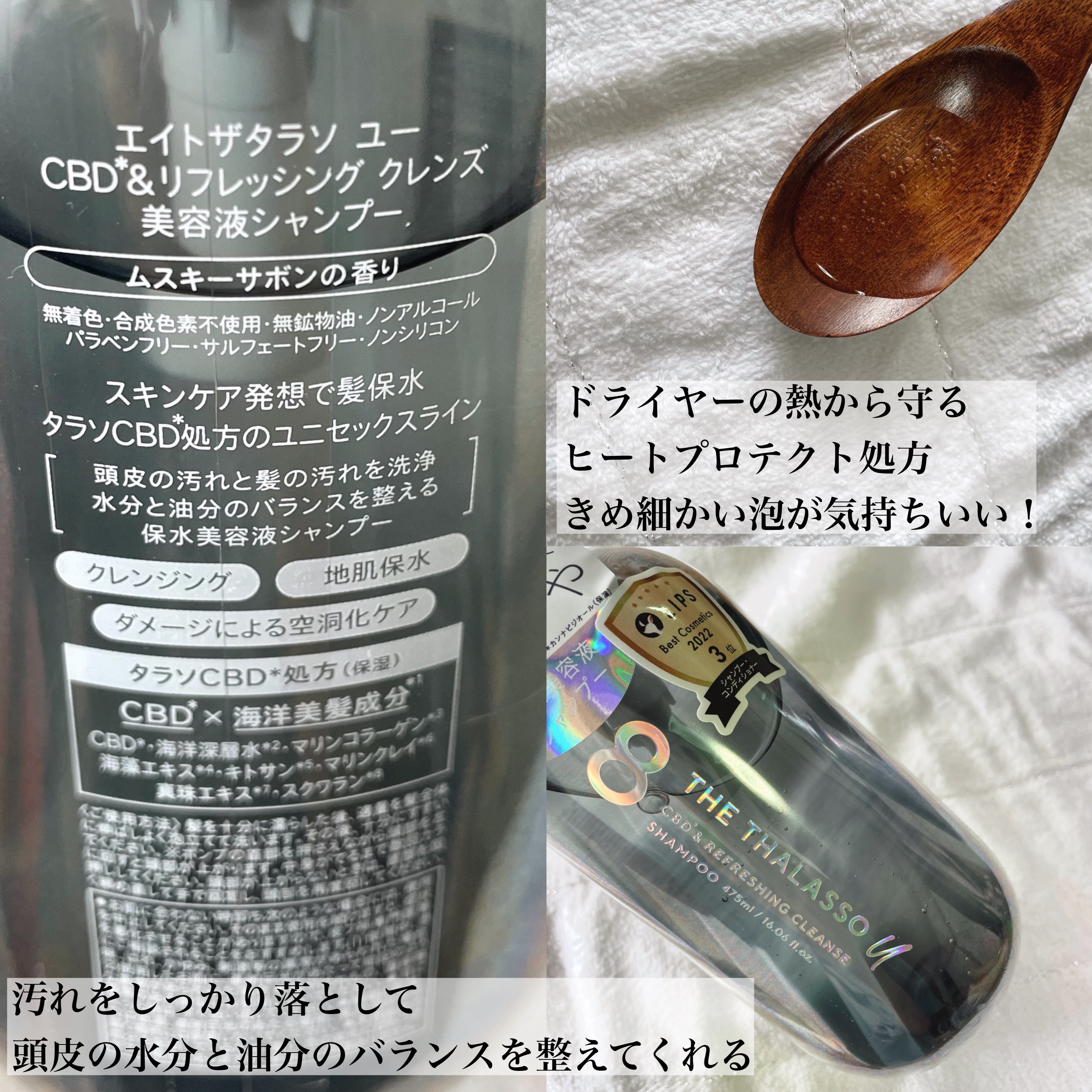 LIPSでも大人気のエイトザタラソ🫧 今回初めて使いましたが、これシャントリで過去一好きかもしれない😍 エイトザタラソ ユーはスキンケア発想で髪を保水するエイトザタラソのユニセックスライン。独自成分のCBDと海洋美髪成分が配合されていて、保水しつつ頭皮や髪のダメージの修復ケアしてくれます🐟 ムスキーサボンの香りはどこか王道のサボン系の香りではあるものの甘さもほのかにあり、男女問わずに使いやすいし、この香り大好きでした✨