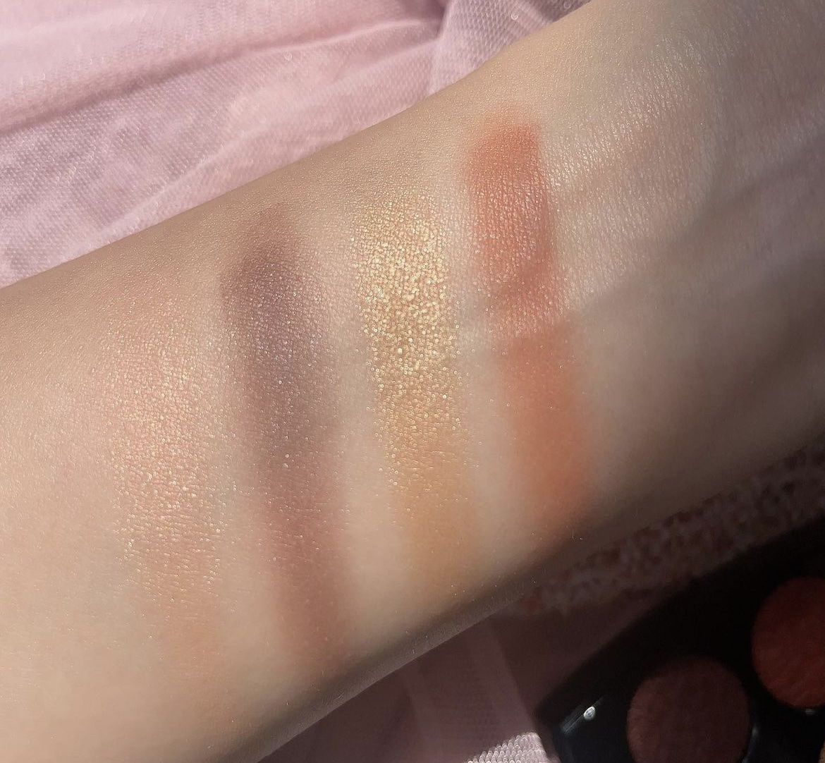 色味は秋らしい温かみのある配色で、目元を華やかに演出します🍁 全体的に細かいラメが含まれており、上品なツヤ感を演出します✨ しっとりとした粉質で、まぶたにしっかりと密着します👁️🗨️