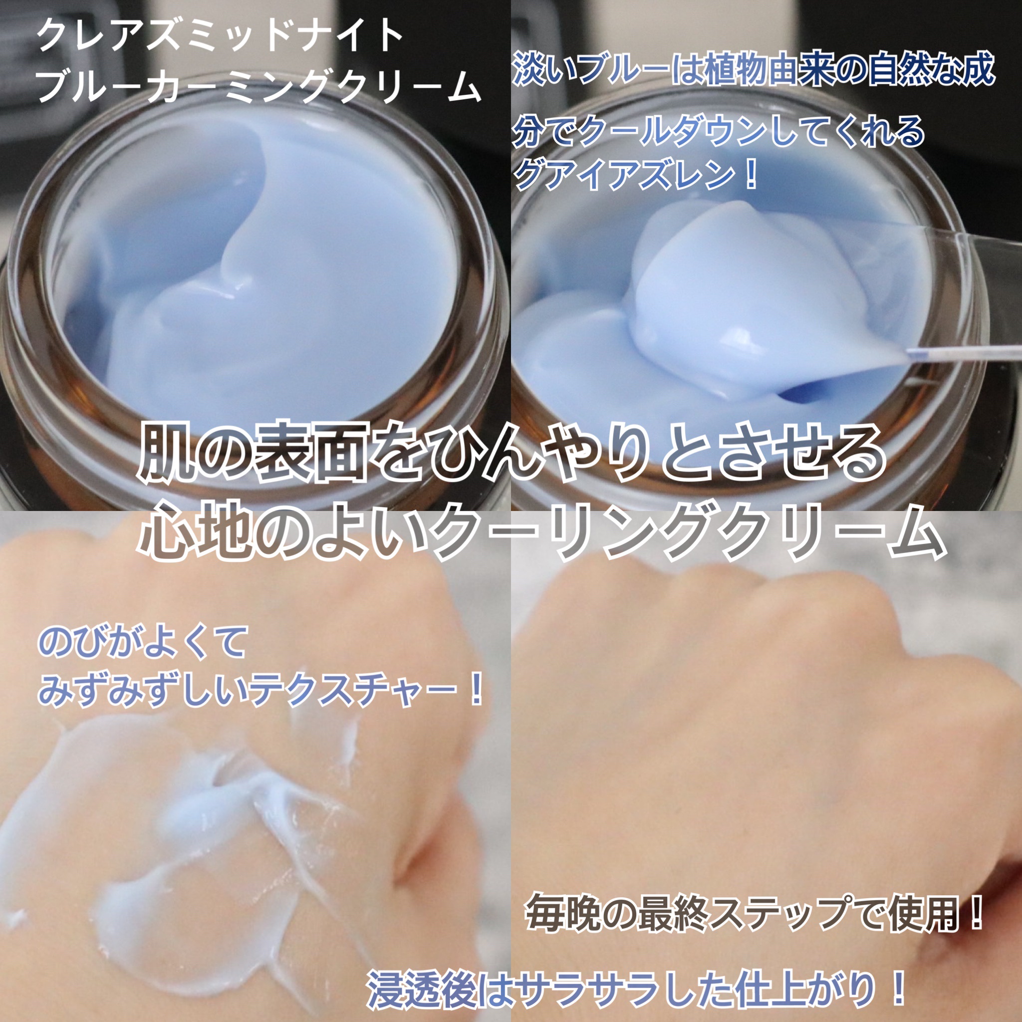 Klairsミッドナイトブルードロップミッドナイトブルーカーミングクリームキレイなブルーのスキンケアラインこの色味は着色料じゃなくって、カモミールオイルから抽出した植物成分の天然原料「グアイアズレン」が含まれてるからなんだそう顔の赤みやニキビ...