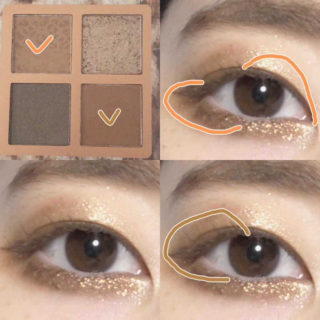 可愛い4色アイシャドウ✨ 落として②がひび割れました😂 見た目が③は黒にラメのシャドウかと思っていたのですが 塗って肌にのせると赤っぽい、ピンク紫?っぽい感じの色でした❣️ ポイントで涙袋キラキラするので涙袋に使用しても可愛い感じでした💕