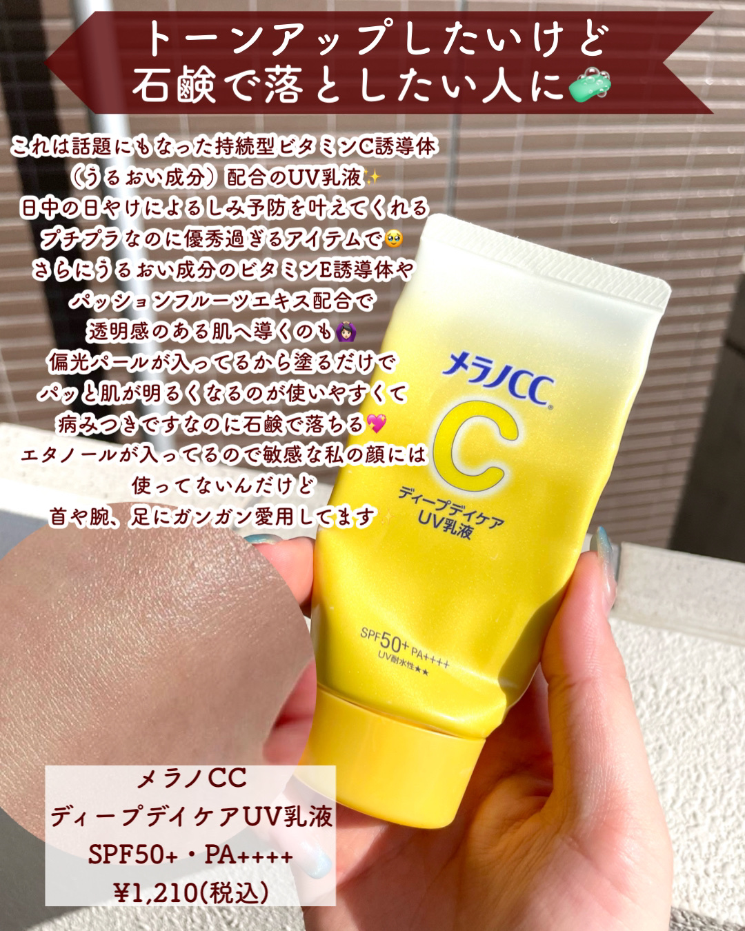 メラノCCディープケア乳液〈日焼け止めミルク〉 SPF50+・PA++++UV耐水性☆☆持続型ビタミンC誘導体(うるおい成分)配合で日中の日焼けによるしみを予防パッと明るく見せる仕上がりで化粧下地としても使えますが顔が敏感なときがあるので私は...