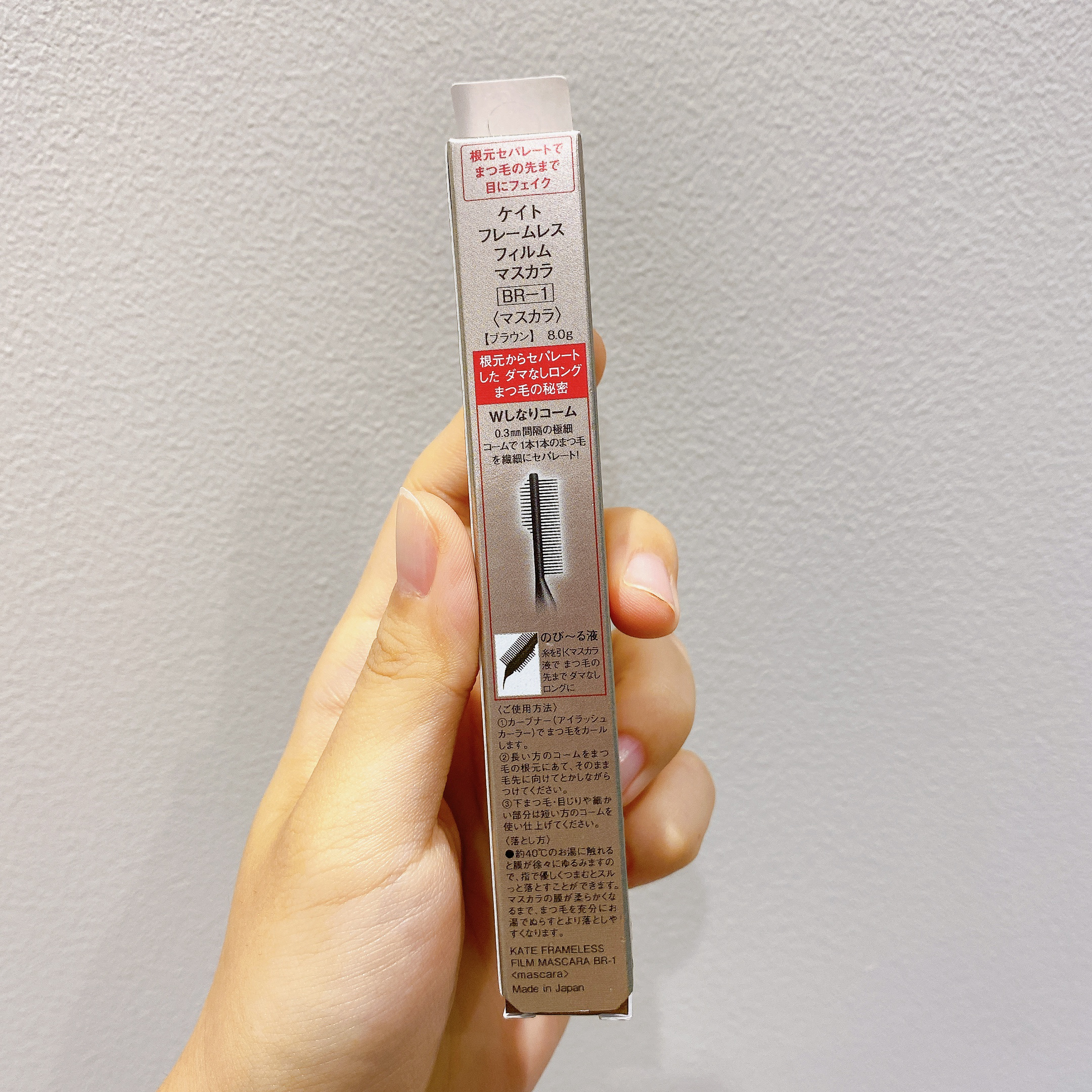 KATEのフレームレスフィルムマスカラはまたの名を美嘘マスカラ!美しい嘘、ってなんだか素敵な名前…!あまり盛った感なく、自睫毛が伸びたような自然な仕上がり。私のカラーはBR-1ブラウンなんですが、明るめのクリーミーな茶色です。瞳が明るく見える...