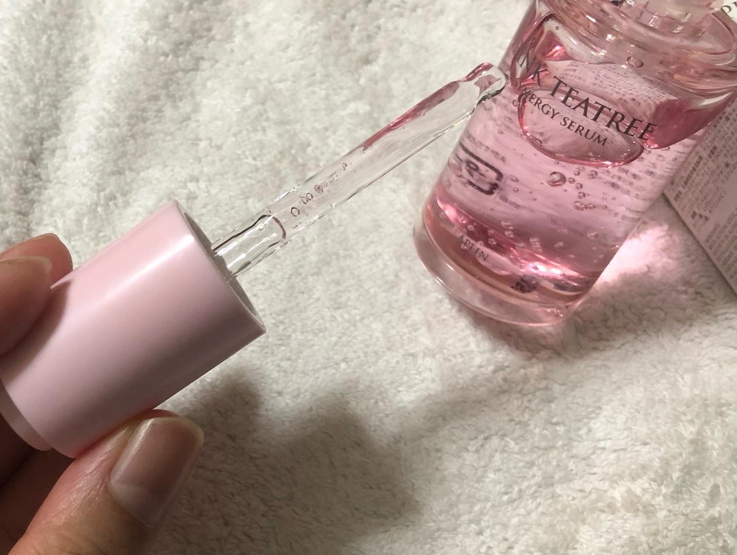 保湿成分のティーツリーやCICAが配合されている美容液です🎀 乾燥からの肌荒れに鎮静効果があり、ニキビに悩んでる方に特におすすめです🫶🏻 みずみずしくニキビ肌でも使いやすい使用感で、使ってるうちにニキビが鎮静されてきた感じがします🎶
