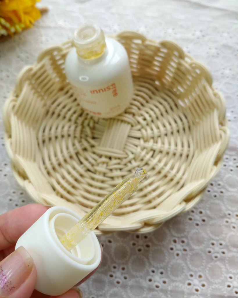 【innisfree ビタCグリーンティーエンザイムブライトセラム】美容液をスポイトで吸い上げてみると、黄色の粒のようなものがあってビックリ!?その正体は、ブランド独自のオイルドロップ処方による、水溶性と油溶性のビタミンC誘導体。肌の角質層に...