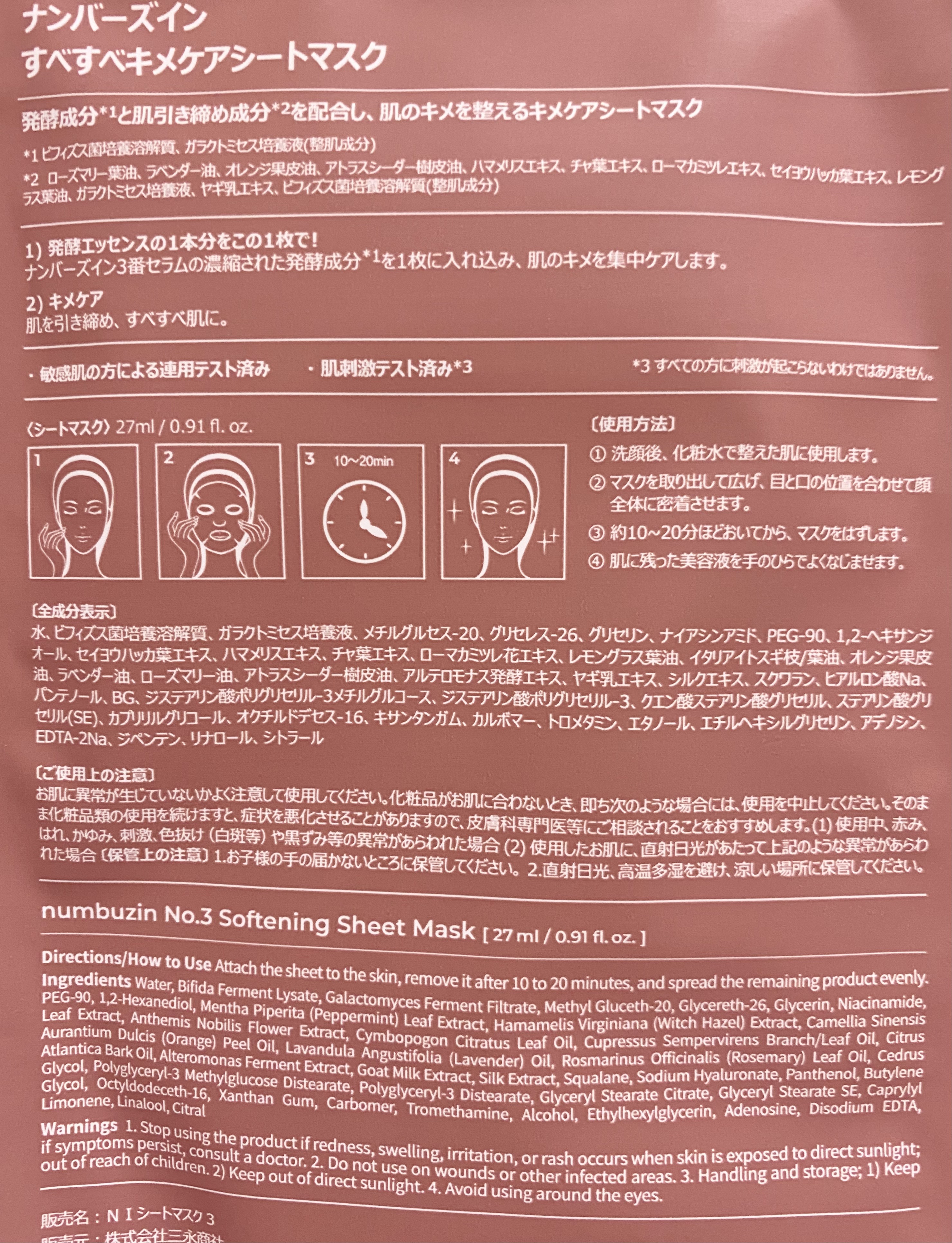 商品詳細情報numbuzin 3番 すべすべキメケアシートマスク
