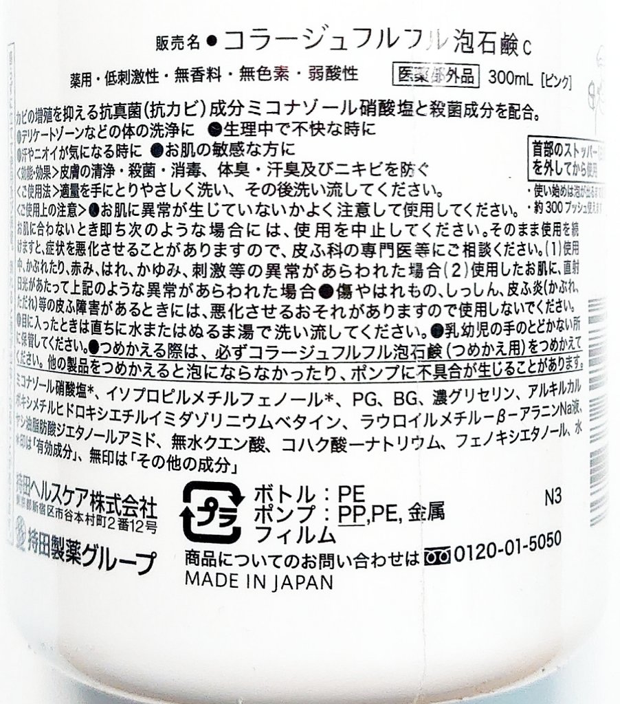 - <300ml(水色)> 有効成分 ミコナゾール硝酸塩、イソプロピルメチルフェノール その他の成分 PG、BG、濃グリセリン、アルキルカルボキシメチルヒドロキシエチルイミダゾリニウムベタイン、ラウロイルメチル-β-アラニンNa液、ヤシ油脂肪酸ジエタノールアミド、無水クエン酸、コハク酸一ナトリウム、フェノキシエタノール、水 <210ml(水色)> 有効成分 ミコナゾール硝酸塩、イソプロピルメチルフェノール その他の成分 PG、BG、濃グリセリン、アルキルカルボキシメチルヒドロキシエチルイミダゾリニウムベタイン、ラウロイルメチル-β-アラニンNa液、ヤシ油脂肪酸ジエタノールアミド、無水クエン酸、コハク酸一ナトリウム、フェノキシエタノール、水 <150ml(水色)> 有効成分 ミコナゾール硝酸塩、イソプロピルメチルフェノール その他の成分 PG、BG、濃グリセリン、アルキルカルボキシメチルヒドロキシエチルイミダゾリニウムベタイン、ラウロイルメチル-β-アラニンNa液、ヤシ油脂肪酸ジエタノールアミド、無水クエン酸、コハク酸一ナトリウム、フェノキシエタノール、水 <300ml(ピンク)> 有効成分 ミコナゾール硝酸塩、イソプロピルメチルフェノール その他の成分 PG、BG、濃グリセリン、アルキルカルボキシメチルヒドロキシエチルイミダゾリニウムベタイン、ラウロイルメチル-β-アラニンNa液、ヤシ油脂肪酸ジエタノールアミド、無水クエン酸、コハク酸一ナトリウム、フェノキシエタノール、水 <210ml(ピンク)> 有効成分 ミコナゾール硝酸塩、イソプロピルメチルフェノール その他の成分 PG、BG、濃グリセリン、アルキルカルボキシメチルヒドロキシエチルイミダゾリニウムベタイン、ラウロイルメチル-β-アラニンNa液、ヤシ油脂肪酸ジエタノールアミド、無水クエン酸、コハク酸一ナトリウム、フェノキシエタノール、水 <150ml(ピンク)> 有効成分 ミコナゾール硝酸塩、イソプロピルメチルフェノール その他の成分 PG、BG、濃グリセリン、アルキルカルボキシメチルヒドロキシエチルイミダゾリニウムベタイン、ラウロイルメチル-β-アラニンNa液、ヤシ油脂肪酸ジエタノールアミド、無水クエン酸、コハク酸一ナトリウム、フェノキシエタノール、水