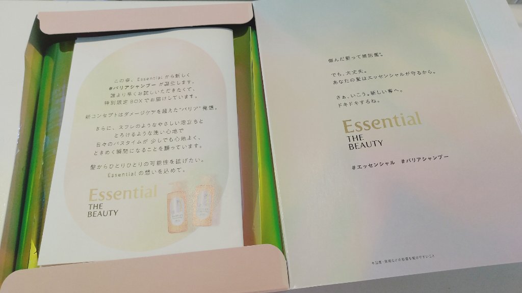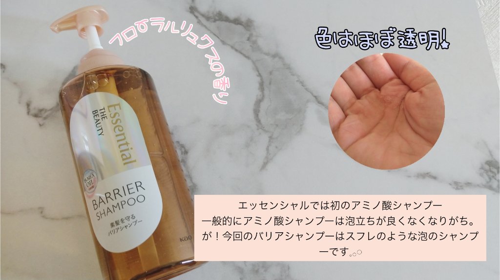 エッセンシャルプレミアムバリアシャンプー・コンディショナーシルキー&スムース〈説明〉・シャンプー・コンディショナー・450ml(両方とも)〈感想〉ホワイトピーチ&ムスクの香りは良い匂いで良かったです。シャンプーの洗浄力には私的には満足しました...