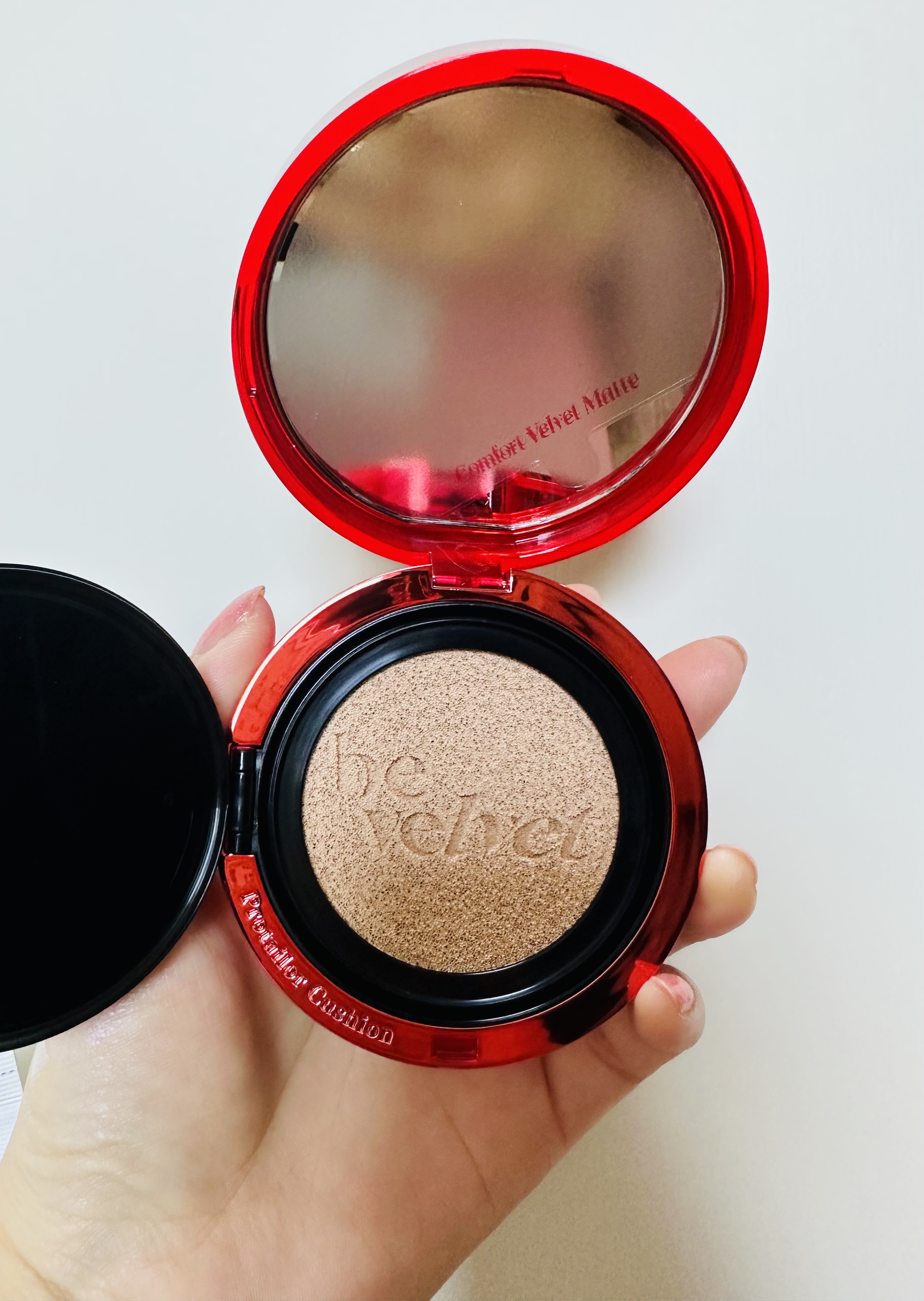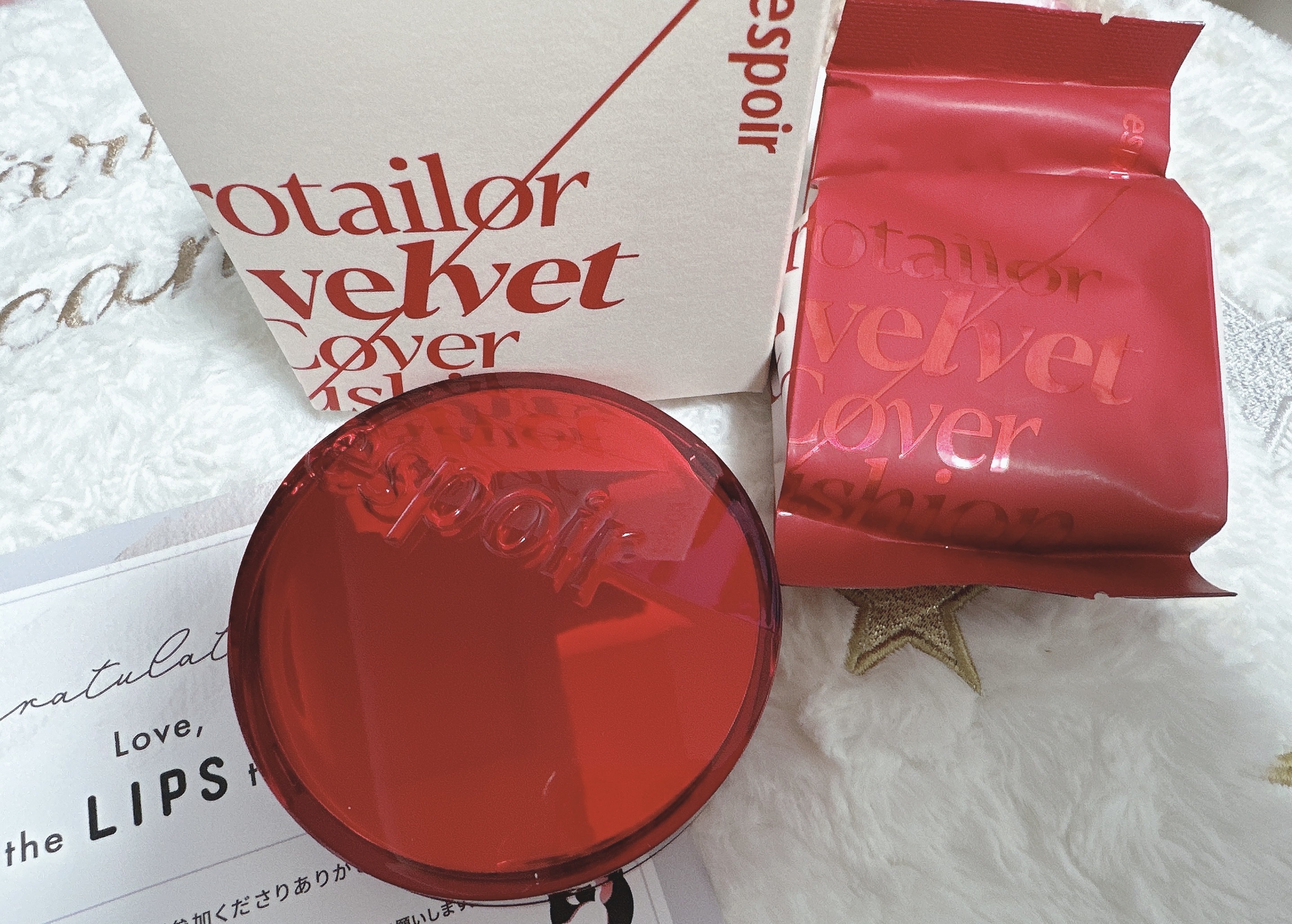 <espoirビーベルベットカバークッション>を愛用中♪鮮やかな赤色が目を引く、高級感のある素敵な容器デザイン。手に取るたびにテンションが上がります。中は大きな鏡としずく型パフが内蔵されています。さらに未開封の追加パフも入っているので、1箱に...