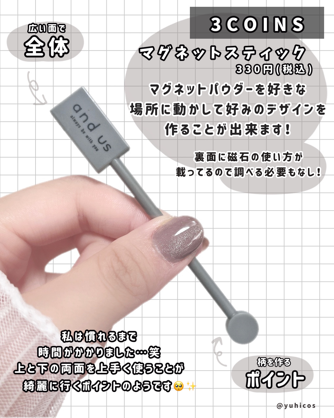 3COINS愛用品💅マグネットスティックネイルジェル330円2gM02シルクベージュ✅JANコード:2236719891136✅硬化不良になりにくい⭕️✅マグネットで光らせるので、多少のアラはカバーされる✅シルクベージュは、白ではなく、ベージ...