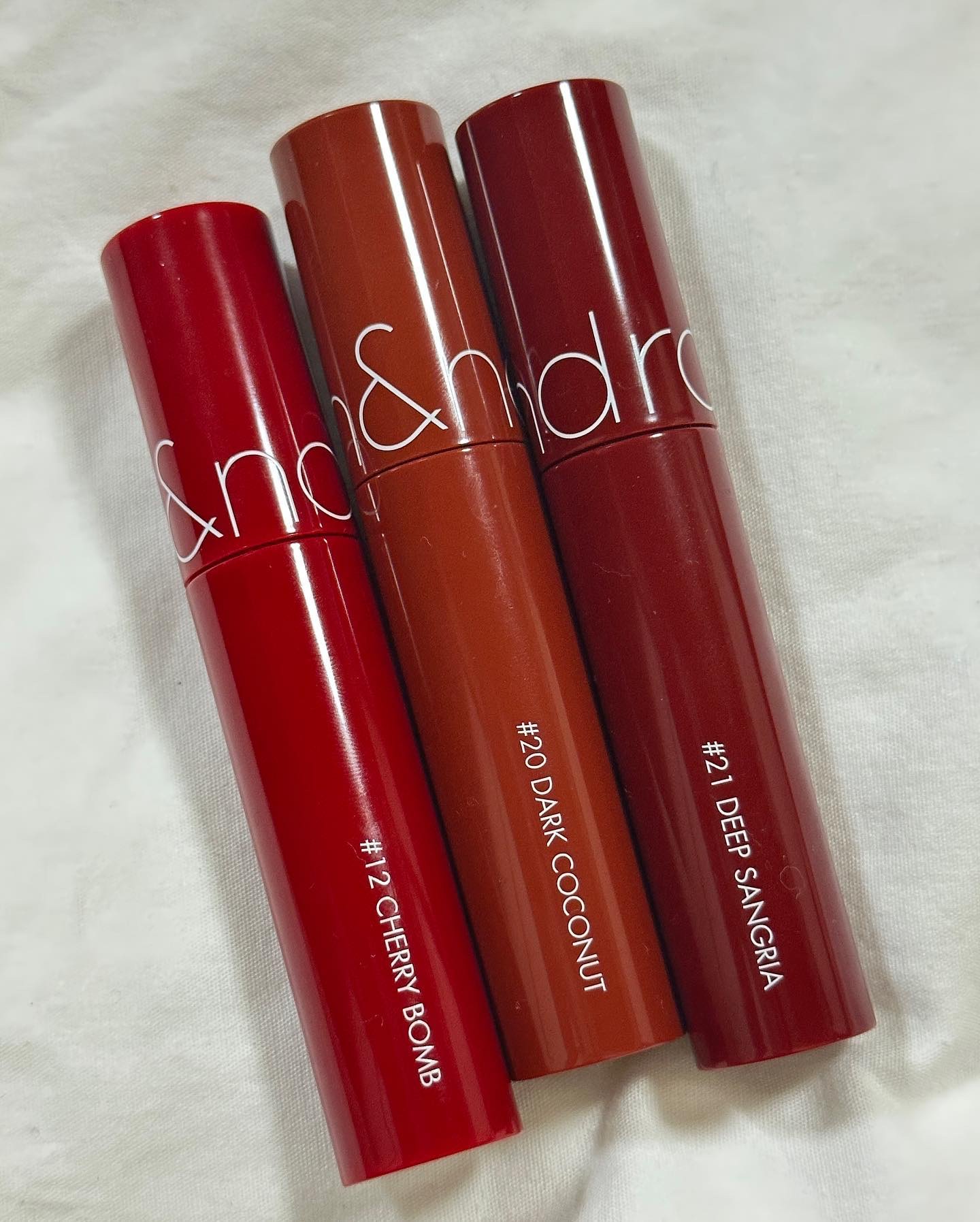 rom&ndのジューシーラスティングティントリメイク前バージョンです。#12CHERRYBOMB#17PLUMCOKE#21DEEPSANGRIAシロップを唇につけるような粘り感😂何回を分けて重ねていく方が綺麗に塗られますが、すごく時間かかり...