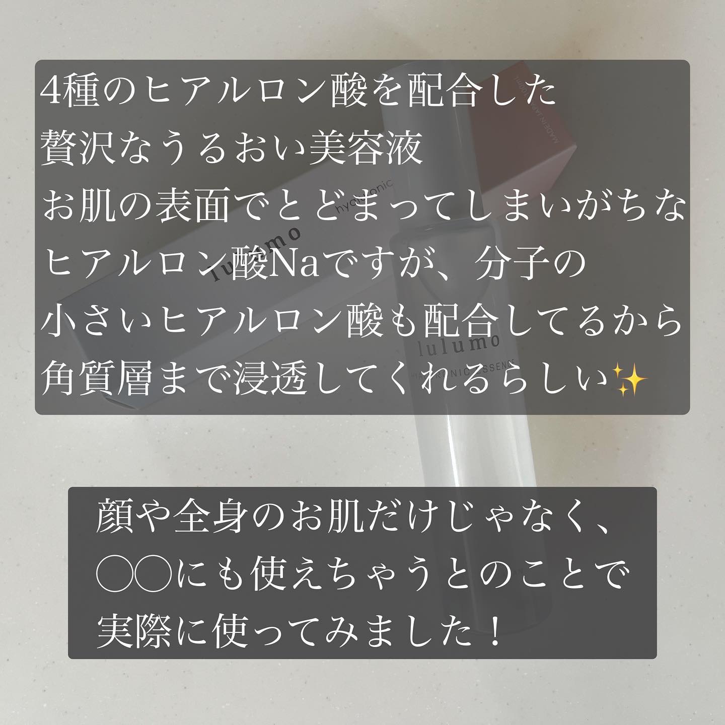 - すーっと角質層まで浸透。低分子ヒアルロン酸*をはじめ、4種類のヒアルロン酸*を贅沢配合した原液。ヒアルロン酸Naは肌表面にとどまり潤いベールでお肌を乾燥から守ります。lulumoはこれにさらに3種類の“低分子ヒアルロン酸*”を配合することで、角質層まで潤いを届ける処方にこだわりました。普段の基礎スキンケアにワンプッシュ加えるだけで、うるおいあふれる極上の肌へと導きます。 *保湿成分