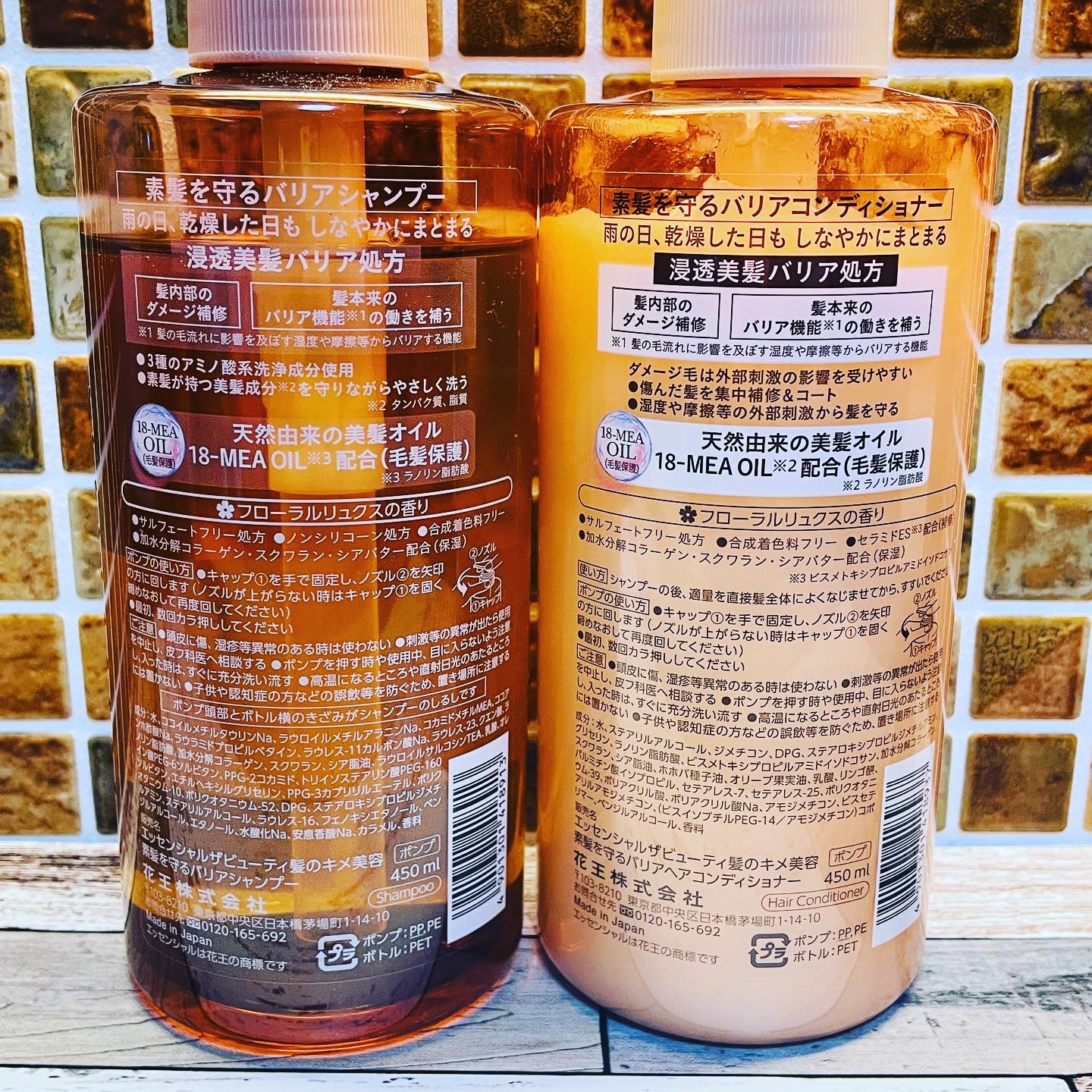 - うる髪続くバリアシャンプー・コンディショナー 雨の日、乾燥した日も しなやかにまとまる 【バリアシャンプー・コンディショナー共通】 ●浸透美髪バリア処方 ・髪内部のダメージ補修 ・ 髪本来のバリア機能*の働きを補う *髪の毛流れに変化を及ぼす湿度・摩擦等からバリアする機能 ●天然由来の美髪オイル 18-MEA OIL*配合(毛髪保護)*ラノリン脂肪酸 ●サルフェートフリー処方 ●合成着色料フリー ●加水分解コラーゲン・スクワラン・シアバター配合(保湿) ✿フローラルリュクスの香り 【バリアシャンプー】 ●3種のアミノ酸系洗浄成分使用 ●とろふわスフレ泡で素髪が持つ美髪成分*を守りながらやさしく洗う *タンパク質、脂質 ●ノンシリコーン処方 【バリアコンディショナー】 ●傷んだ髪を集中補修&コート ●湿度や摩擦等の外部刺激から髪を守る ●セラミドES*配合(補修)*ビスメトキシプロプルアミドイソドコサン