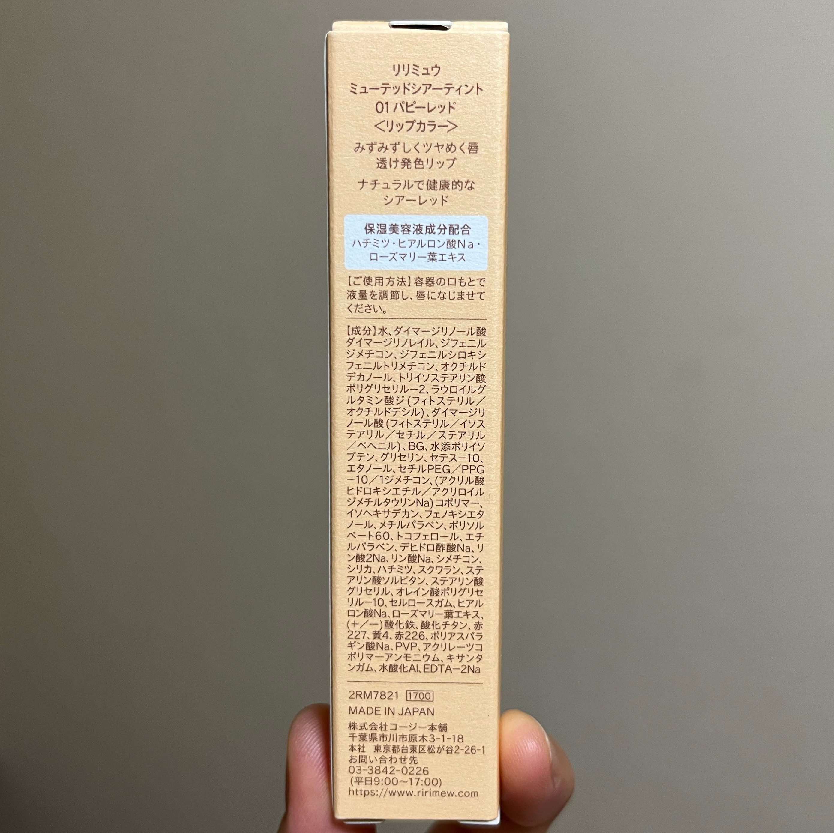 - <01 パピーレッド> 水、ダイマージリノール酸ダイマージリノレイル、ジフェニルジメチコン、ジフェニルシロキシフェニルトリメチコン、オクチルドデカノール、トリイソステアリン酸ポリグリセリルー2、ラウロイルグルタミン酸ジ(フィトステリル/オクチルドデシル)、ダイマージリノール酸(フィトステリル/イソステアリル/セチル/ステアリル/ベヘニル)、BG、水添ポリイソブテン、グリセリン、セテスー10、エタノール、セチルPEG/PPGー10/1ジメチコン、(アクリル酸ヒドロキシエチル/アクリロイルジメチルタウリンNa)コポリマー、イソヘキサデカン、フェノキシエタノール、メチルパラベン、ポリソルベート60、トコフェロール、エチルパラベン、デヒドロ酢酸Na、リン酸2Na、リン酸Na、シメチコン、シリカ、ハチミツ、スクワラン、ステアリン酸ソルビタン、ステアリン酸グリセリル、オレイン酸ポリグリセリルー10、セルロースガム、ヒアルロン酸Na、ローズマリー葉エキス、(+/ー)酸化鉄、酸化チタン、赤227、黄4、赤226、ポリアスパラギン酸Na、PVP、アクリレーツコポリマーアンモニウム、キサンタンガム、水酸化Al、EDTAー2Na <02 ピンクフォンデュ> 水、ダイマージリノール酸ダイマージリノレイル、ジフェニルジメチコン、ジフェニルシロキシフェニルトリメチコン、オクチルドデカノール、トリイソステアリン酸ポリグリセリルー2、ラウロイルグルタミン酸ジ(フィトステリル/オクチルドデシル)、ダイマージリノール酸(フィトステリル/イソステアリル/セチル/ステアリル/ベヘニル)、BG、水添ポリイソブテン、グリセリン、セテスー10、エタノール、セチルPEG/PPGー10/1ジメチコン、(アクリル酸ヒドロキシエチル/アクリロイルジメチルタウリンNa)コポリマー、イソヘキサデカン、フェノキシエタノール、メチルパラベン、ポリソルベート60、トコフェロール、エチルパラベン、デヒドロ酢酸Na、リン酸2Na、リン酸Na、シメチコン、シリカ、ハチミツ、スクワラン、ステアリン酸ソルビタン、ステアリン酸グリセリル、オレイン酸ポリグリセリルー10、セルロースガム、ヒアルロン酸Na、ローズマリー葉エキス、(+/ー)酸化鉄、酸化チタン、赤227、黄4、赤226、ポリアスパラギン酸Na、PVP、アクリレーツコポリマーアンモニウム、キサンタンガム、水酸化Al、EDTAー2Na <03 リッチグァバティー> 水、ダイマージリノール酸ダイマージリノレイル、ジフェニルジメチコン、グリセリン、ジフェニルシロキシフェニルトリメチコン、オクチルドデカノール、BG、トリイソステアリン酸ポリグリセリル-2、ダイマージリノール酸(フィトステリル/イソステアリル/セチル/ステアリル/ベヘニル)、セチルPEG/PPG-10/1ジメチコン、セテス-10、水添ポリイソブテン、ステアリン酸グリセリル(SE)、フェノキシエタノール、カルボマー、水酸化K、ステアロイルグルタミン酸Na、メチルパラベン、(アクリレーツ/アクリル酸アルキル(C10-30))クロスポリマー、トコフェロール、ポリソルベート80、ハチミツ、ヒアルロン酸Na、ローズマリー葉エキス、酸化チタン、酸化鉄、赤227、黄4、黄5、シリカ、水酸化Al、赤104(1)、青1 <04 オレンジアールグレイ> 水、ダイマージリノール酸ダイマージリノレイル、ジフェニルジメチコン、グリセリン、ジフェニルシロキシフェニルトリメチコン、オクチルドデカノール、BG、トリイソステアリン酸ポリグリセリル-2、ダイマージリノール酸(フィトステリル/イソステアリル/セチル/ステアリル/ベヘニル)、セチルPEG/PPG-10/1ジメチコン、セテス-10、水添ポリイソブテン、ステアリン酸グリセリル(SE)、フェノキシエタノール、カルボマー、水酸化K、ステアロイルグルタミン酸Na、メチルパラベン、(アクリレーツ/アクリル酸アルキル(C10-30))クロスポリマー、トコフェロール、ハチミツ、ヒアルロン酸Na、ローズマリー葉エキス、酸化鉄、黄4、赤227、黄5、シリカ <05 コンポートピンク> 水、ジフェニルジメチコン、ダイマージリノール酸ダイマージリノレイル、グリセリン、ジフェニルシロキシフェニルトリメチコン、オクチルドデカノール、BG、トリイソステアリン酸ポリグリセリル-2、ダイマージリノール酸(フィトステリル/イソステアリル/セチル/ステアリル/ベヘニル)、水添ポリイソブテン、セテス-10、セチルPEG/PPG-10/1ジメチコン、ステアリン酸グリセリル(SE)、フェノキシエタノール、カルボマー、水酸化K、ステアロイルグルタミン酸Na、(アクリレーツ/アクリル酸アルキル(C10-30))クロスポリマー、メチルパラベン、トコフェロール、ポリソルベート80、ハチミツ、ヒアルロン酸Na、ローズマリー葉エキス、(+/-)酸化チタン、酸化鉄、赤227、赤104(1)、黄4、黄5、シリカ、水酸化Al、青1 <06 ピンクマーガレット> 水、ジフェニルジメチコン、ダイマージリノール酸ダイマージリノレイル、グリセリン、ジフェニルシロキシフェニルトリメチコン、オクチルドデカノール、BG、トリイソステアリン酸ポリグリセリル-2、ダイマージリノール酸(フィトステリル/イソス