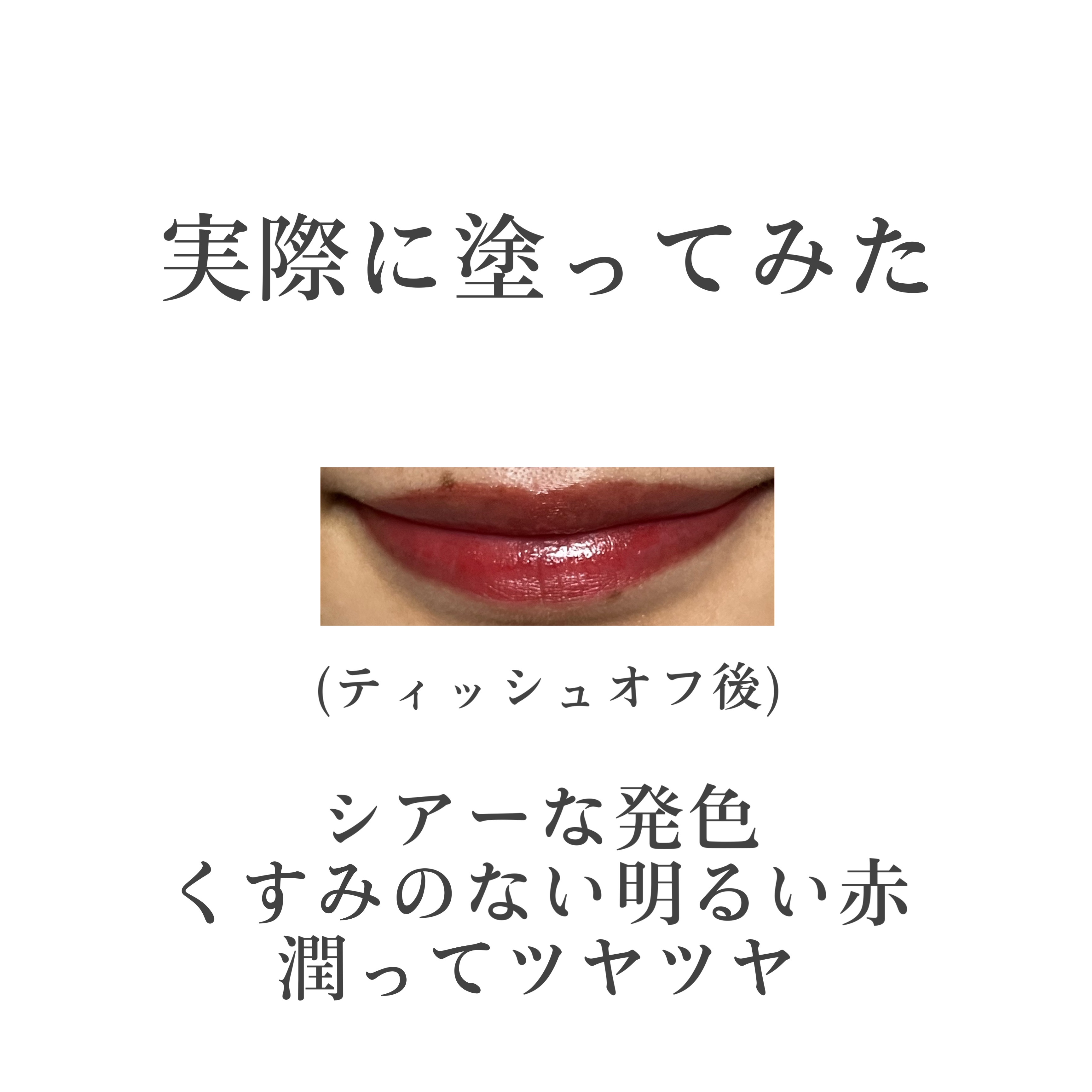 顔色がパッと明るくなるピュアレッド❣️ 上品なツヤとじゅわっと発色で、とっても使いやすい赤リップ。 特にイエベ春さんにおすすめです! 色もちも良く、ティッシュオフしても色がちゃんと残ってくれました◎