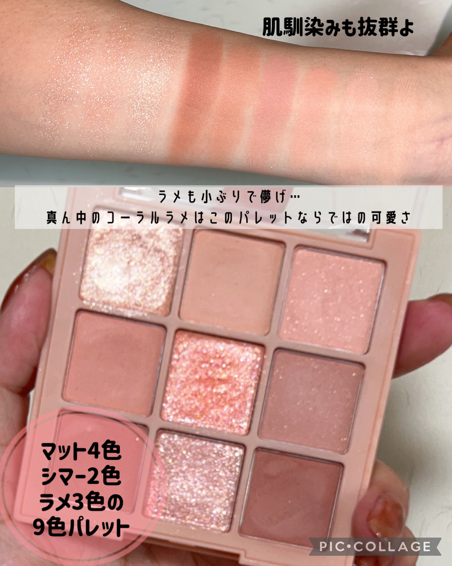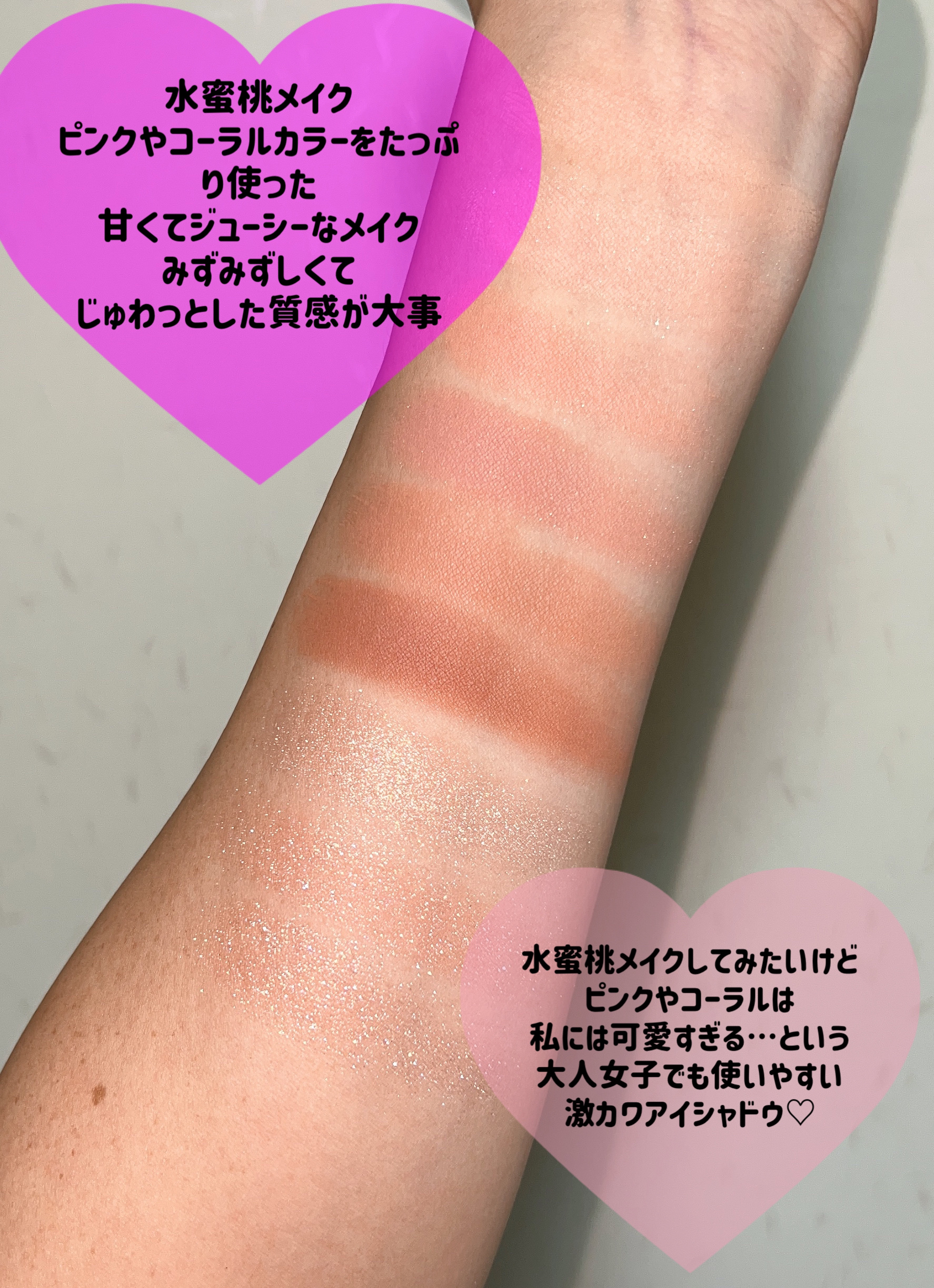 色味はまさにコーラルピンクって感じの温かみのあるカラー🍑 発色も良く、なによりラメが細かくてキラッキラでかわいいの🥹 イエベ春さんはピンクアイシャドウ得意だと思うからすごくオススメだけど何よりイエべ秋さんに使って見てほしい! 明るすぎない落ち着いたコーラルピンクだから凄く使いやすくてオススメだよ💞