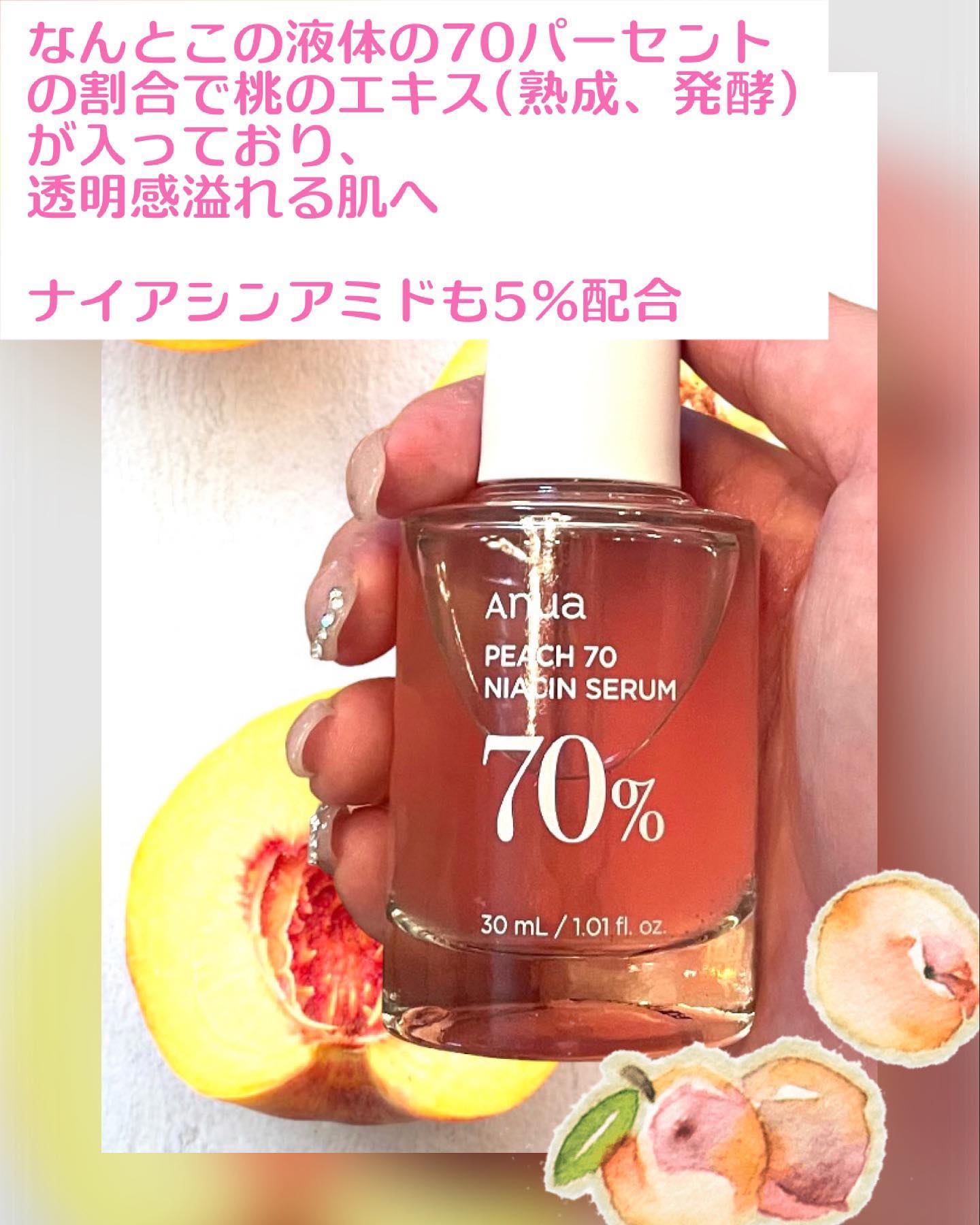 .Anua(アヌア)桃70%ナイアシンセラム30ml以前Anuaドクダミ80%水分沈静アンプルを試させていただいてリピートして愛用中なんですがなんと今回は2023年1月1日に新発売されているこちらを試させていただきました🍑「つるんと白桃肌を叶...