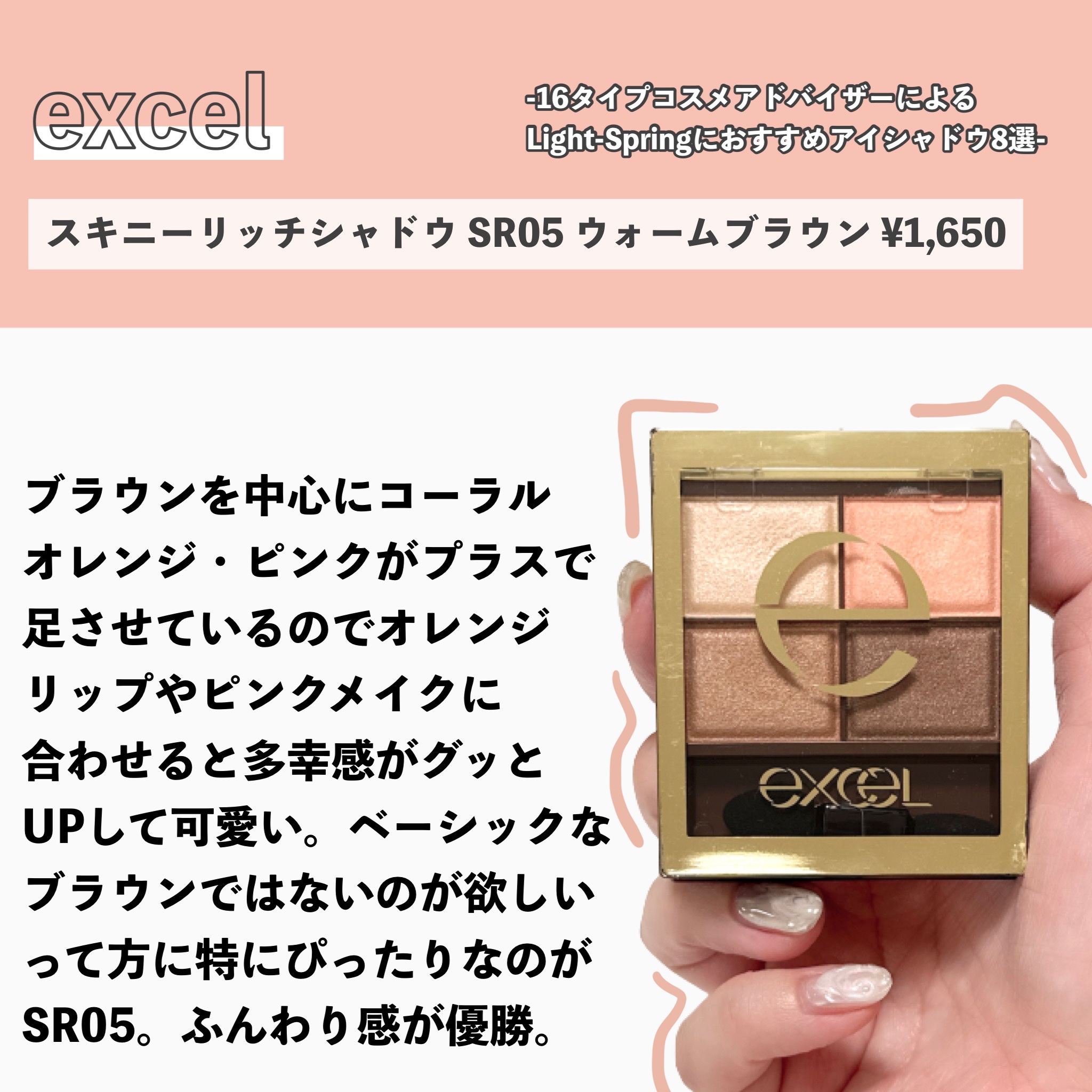 1stライトスプリング2ndライトサマーです! こんな投稿を探していました!! EXCELのスキニーリッチシャドウ、どれを買おうか迷っていて03か01にしようか悩んだのですが…こちらの投稿を参考にさせていただきます!(どれも難関はなさそうかな?と思っていたのですが思ったより優勝カラーが多くて悩んじゃいますね…!)