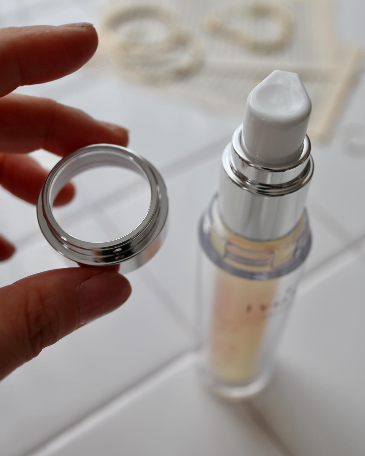 贅沢に美容成分を配合しているクリームは思ったより軽く、みずみずしく、素肌によくのびます。べとつきはしないかな。 プッシュしてエアレスボトルから新鮮なクリームが出てくるから量も調節しやすい🙆♀️ クリームはジェルのようにみずみずしいよ。少し高級化粧品によくあるような独特の香りがします。 ピンク色のエアーレスのボトル プッシュするとクリームが出てきます。