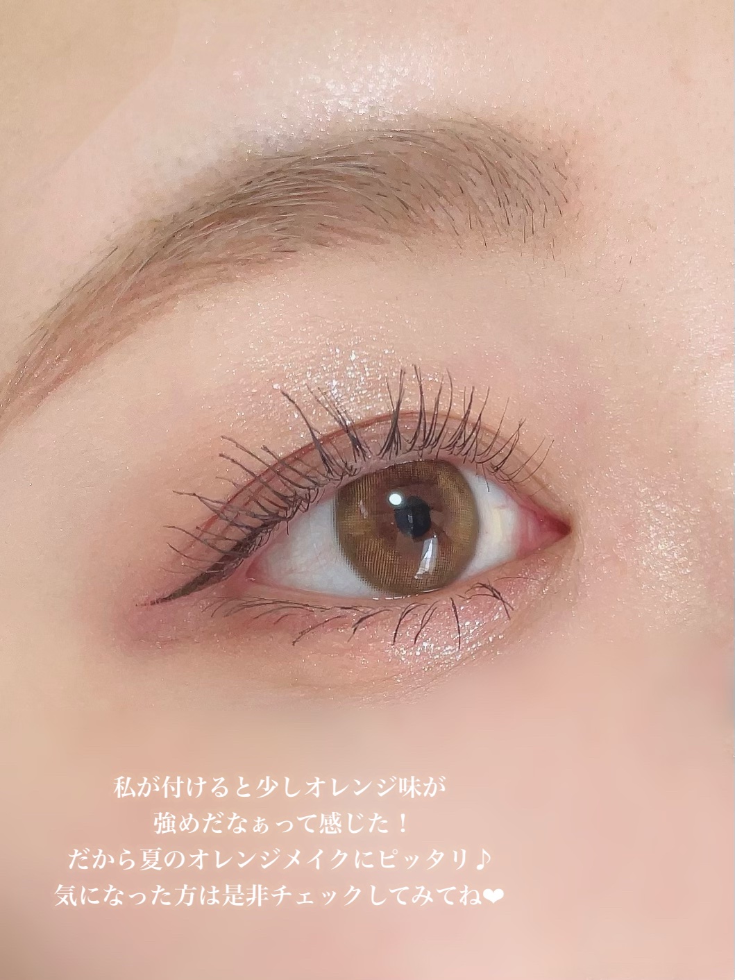 このアイシャドウは発色は薄めだけど その代わりにラメが凄くて!! なのでオレンジメイクしたいけど なかなか挑戦出来ない方とかにも◎ オレンジを単体で塗れば可愛い印象に ブラウンを加えれば大人っぽい印象に とっても可愛いアイシャドウなので 是非チェックしてみてください🍯💗
