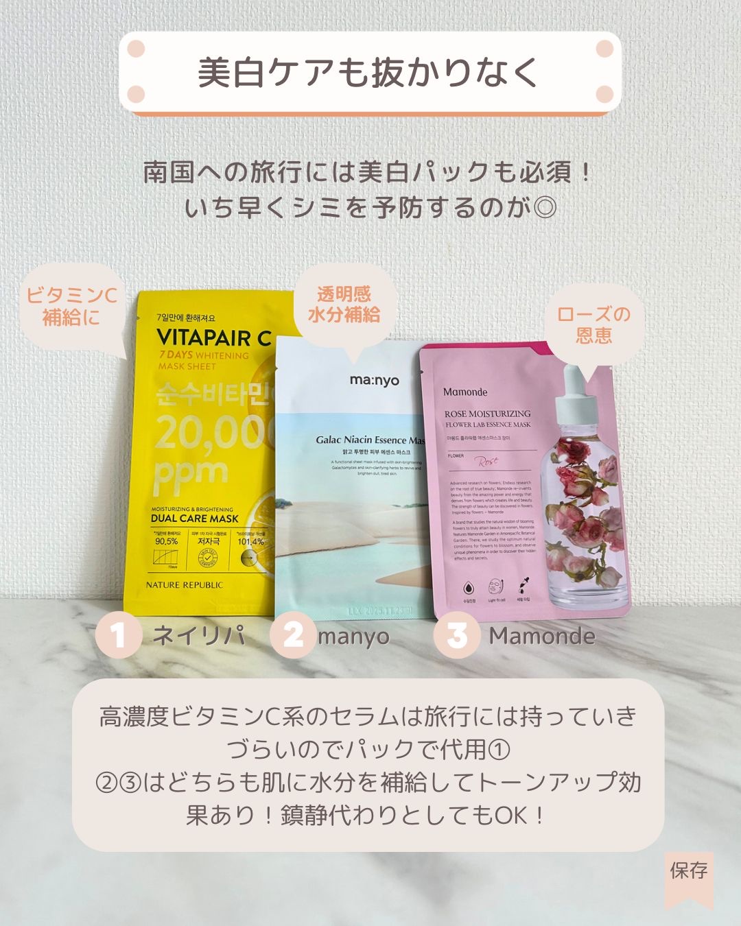 環境変化による乾燥や、肌の揺らぎ、紫外線、食生活の変化などを考えて、やっぱり鎮静と抗酸化は必要✊🏼 あとは保湿力の高い美容液もあると完璧です👏🏼 パックは、あってもなくてもいいかな、派で(旅行中って疲れてバタンキューしがちなので) 最低限の化粧水、お気に入りの美容液、クリームでもいいかなと思います🤲🏻 その代わり、旅行前は肌調子を整えておいて、 帰ってきたらたっぷりの保湿で疲れを癒してあげるのがいいかなと思います😽 旅行中は、スキンケアよりも旅行を楽しむことが一番!!