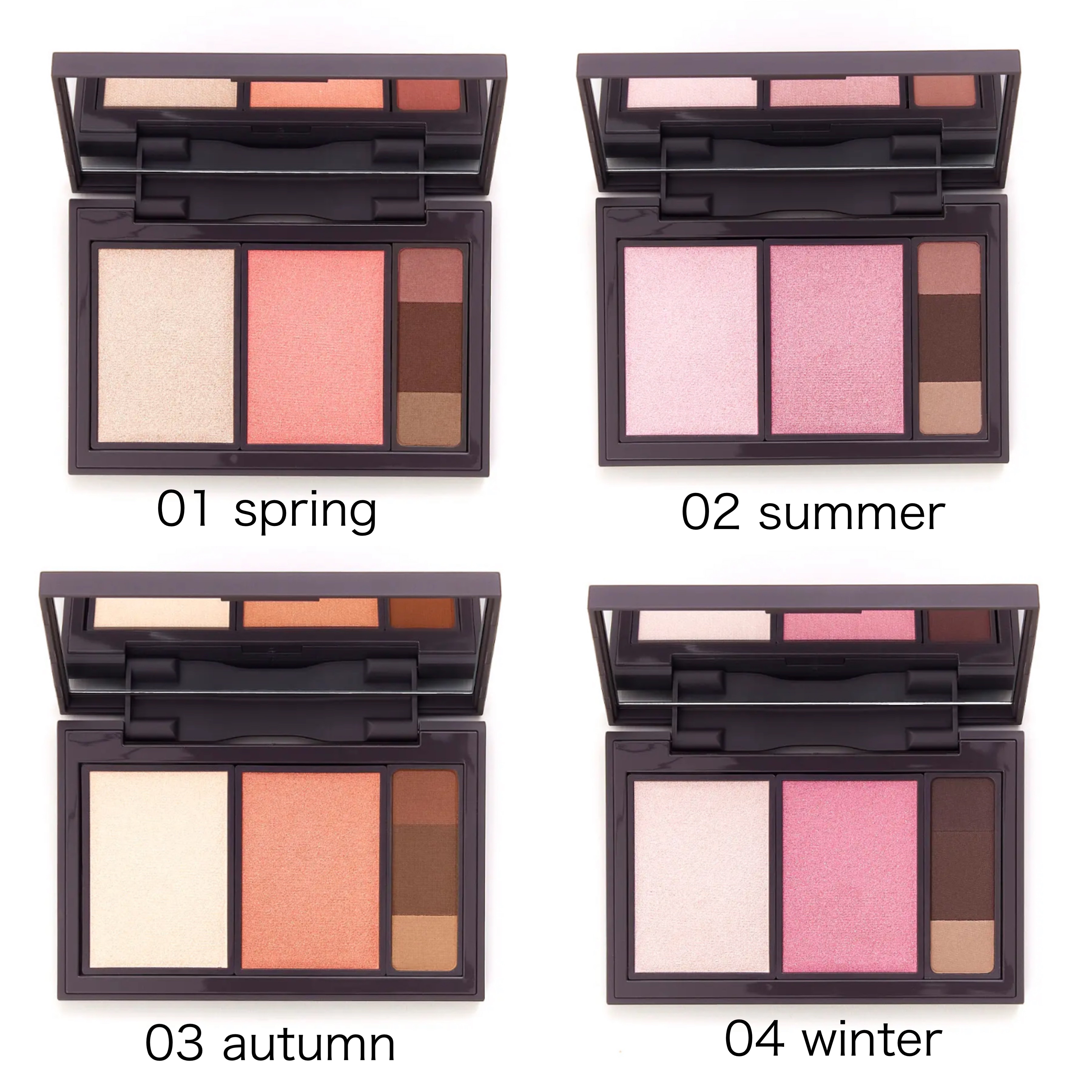 - ハイライト・チーク・アイブロウが1つになった、オールインワンパレット。 すべてアイシャドウともしても使用可能なので、これ一つでメイクが完成します! 春夏秋冬、それぞれのパーソナルカラーにあったカラー展開なので、あなたにぴったりのパレットが見つかる。