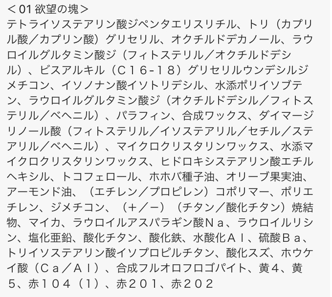 - <01 欲望の塊> テトライソステアリン酸ジペンタエリスリチル、トリ(カプリル酸/カプリン酸)グリセリル、オクチルドデカノール、ラウロイルグルタミン酸ジ(フィトステリル/オクチルドデシル)、ビスアルキル(C16-18)グリセリルウンデシルジメチコン、イソノナン酸イソトリデシル、水添ポリイソブテン、ラウロイルグルタミン酸ジ(オクチルドデシル/フィトステリル/ベヘニル)、パラフィン、合成ワックス、ダイマージリノール酸(フィトステリル/イソステアリル/セチル/ステアリル/ベヘニル)、マイクロクリスタリンワックス、水添マイクロクリスタリンワックス、ヒドロキシステアリン酸エチルヘキシル、トコフェロール、ホホバ種子油、オリーブ果実油、アーモンド油、(エチレン/プロピレン)コポリマー、ポリエチレン、ジメチコン、(+/-)(チタン/酸化チタン)焼結物、マイカ、ラウロイルアスパラギン酸Na、ラウロイルリシン、塩化亜鉛、酸化チタン、酸化鉄、水酸化Al、硫酸Ba、トリイソステアリン酸イソプロピルチタン、酸化スズ、ホウケイ酸(Ca/Al)、合成フルオロフロゴパイト、黄4、黄5、赤104(1)、赤201、赤202 <02 ピンクバナナ> テトライソステアリン酸ジペンタエリスリチル、トリ(カプリル酸/カプリン酸)グリセリル、オクチルドデカノール、ラウロイルグルタミン酸ジ(フィトステリル/オクチルドデシル)、ビスアルキル(C16-18)グリセリルウンデシルジメチコン、イソノナン酸イソトリデシル、水添ポリイソブテン、ラウロイルグルタミン酸ジ(オクチルドデシル/フィトステリル/ベヘニル)、パラフィン、合成ワックス、ダイマージリノール酸(フィトステリル/イソステアリル/セチル/ステアリル/ベヘニル)、マイクロクリスタリンワックス、水添マイクロクリスタリンワックス、ヒドロキシステアリン酸エチルヘキシル、トコフェロール、ホホバ種子油、オリーブ果実油、アーモンド油、(エチレン/プロピレン)コポリマー、ポリエチレン、ジメチコン、(+/-)(チタン/酸化チタン)焼結物、マイカ、ラウロイルアスパラギン酸Na、ラウロイルリシン、塩化亜鉛、酸化チタン、酸化鉄、水酸化Al、硫酸Ba、トリイソステアリン酸イソプロピルチタン、酸化スズ、ホウケイ酸(Ca/Al)、合成フルオロフロゴパイト、黄4、黄5、赤104(1)、赤201、赤202 <03 陽炎> テトライソステアリン酸ジペンタエリスリチル、トリ(カプリル酸/カプリン酸)グリセリル、オクチルドデカノール、ラウロイルグルタミン酸ジ(フィトステリル/オクチルドデシル)、ビスアルキル(C16-18)グリセリルウンデシルジメチコン、イソノナン酸イソトリデシル、水添ポリイソブテン、ラウロイルグルタミン酸ジ(オクチルドデシル/フィトステリル/ベヘニル)、パラフィン、合成ワックス、ダイマージリノール酸(フィトステリル/イソステアリル/セチル/ステアリル/ベヘニル)、マイクロクリスタリンワックス、水添マイクロクリスタリンワックス、ヒドロキシステアリン酸エチルヘキシル、トコフェロール、ホホバ種子油、オリーブ果実油、アーモンド油、(エチレン/プロピレン)コポリマー、ポリエチレン、ジメチコン、(+/-)(チタン/酸化チタン)焼結物、マイカ、ラウロイルアスパラギン酸Na、ラウロイルリシン、塩化亜鉛、酸化チタン、酸化鉄、水酸化Al、硫酸Ba、トリイソステアリン酸イソプロピルチタン、酸化スズ、ホウケイ酸(Ca/Al)、合成フルオロフロゴパイト、黄4、黄5、赤104(1)、赤201、赤202 <04 パンプキンワイン> テトライソステアリン酸ジペンタエリスリチル、トリ(カプリル酸/カプリン酸)グリセリル、オクチルドデカノール、ラウロイルグルタミン酸ジ(フィトステリル/オクチルドデシル)、ビスアルキル(C16-18)グリセリルウンデシルジメチコン、イソノナン酸イソトリデシル、水添ポリイソブテン、ラウロイルグルタミン酸ジ(オクチルドデシル/フィトステリル/ベヘニル)、パラフィン、合成ワックス、ダイマージリノール酸(フィトステリル/イソステアリル/セチル/ステアリル/ベヘニル)、マイクロクリスタリンワックス、水添マイクロクリスタリンワックス、ヒドロキシステアリン酸エチルヘキシル、トコフェロール、ホホバ種子油、オリーブ果実油、アーモンド油、(エチレン/プロピレン)コポリマー、ポリエチレン、ジメチコン、(+/-)(チタン/酸化チタン)焼結物、マイカ、ラウロイルアスパラギン酸Na、ラウロイルリシン、塩化亜鉛、酸化チタン、酸化鉄、水酸化Al、硫酸Ba、トリイソステアリン酸イソプロピルチタン、酸化スズ、ホウケイ酸(Ca/Al)、合成フルオロフロゴパイト、黄4、黄5、赤104(1)、赤201、赤202 <05 ダークフィグ> テトライソステアリン酸ジペンタエリスリチル、トリ(カプリル酸/カプリン酸)グリセリル、オクチルドデカノール、ラウロイルグルタミン酸ジ(フィトステリル/オクチルドデシル)、ビスアルキル(C16-18)グリセリルウンデシルジメチコン、イソノナン酸イソトリデシル、水添ポリイソブテン、ラウロイルグルタミン酸ジ(オクチルドデシル/フィトステリル/ベヘニル)、