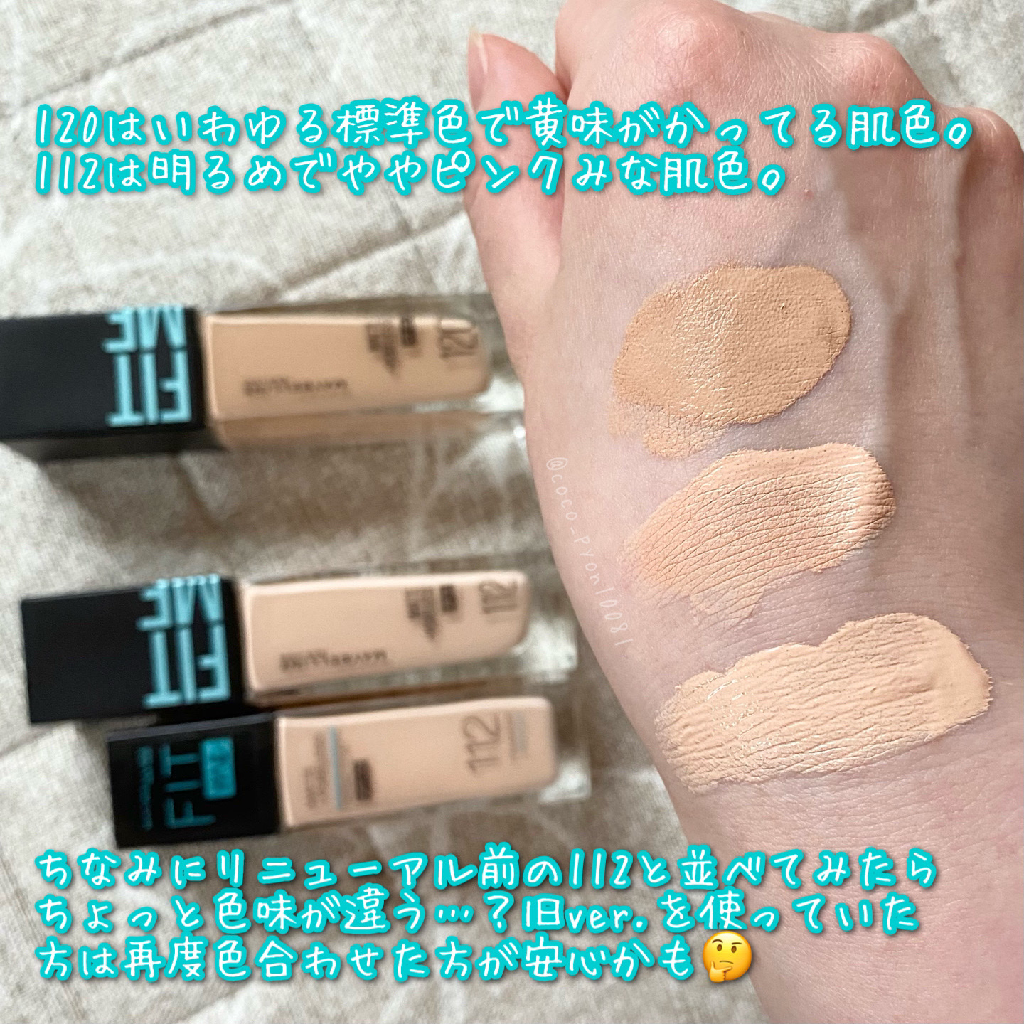 カラバリえぐ!!MAYBELLINENEWYORKフィットミーリキッドファンデーションR112、120ルミマットファンデ人気だけど、、、、フィットミーも負けてないのよ!!軽いつけ心地で肌にぴったり密着し、崩れにくいのがポイント!!毛穴やくすみ...