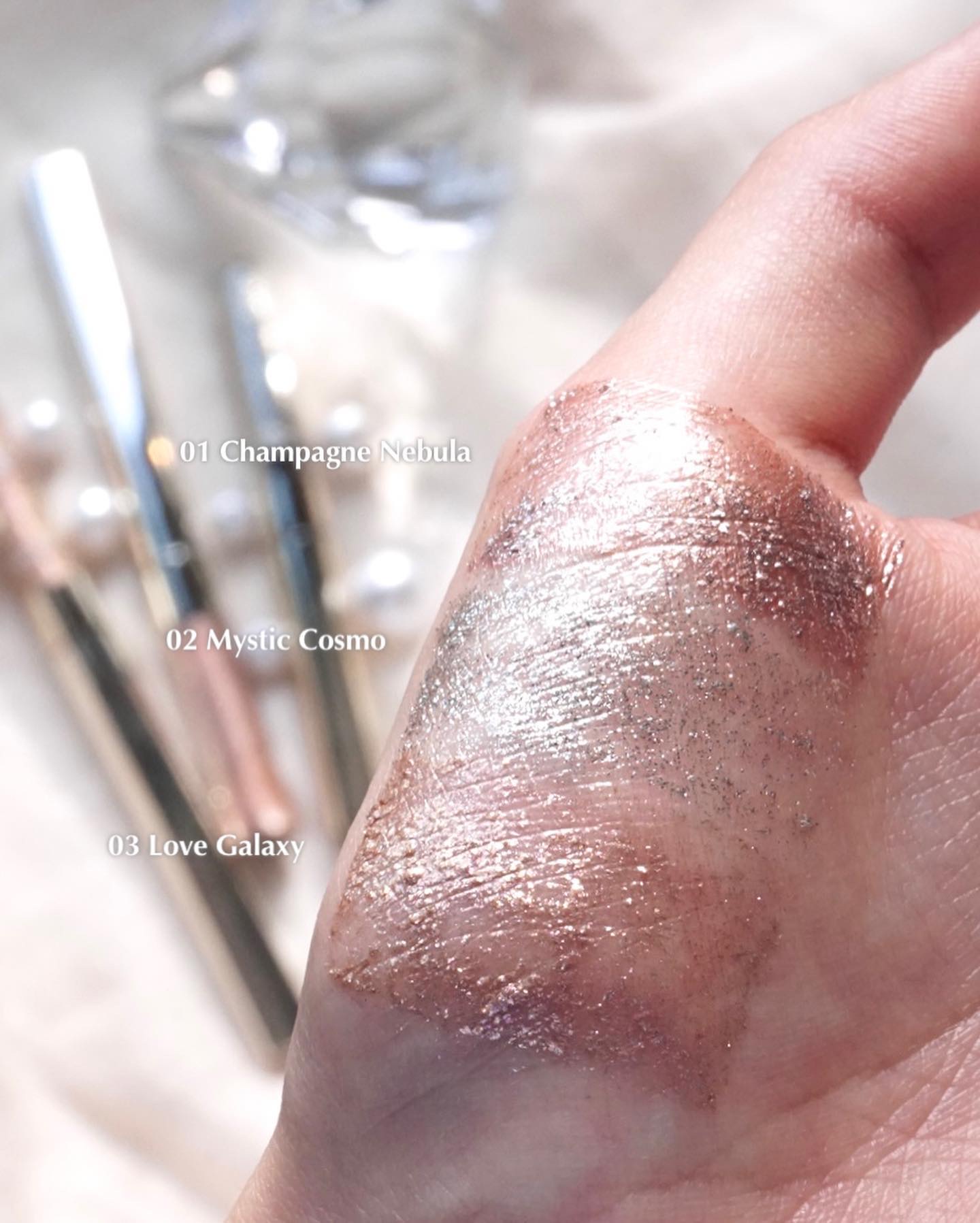 - <星屑のシャンパン> 水、PET、ホウケイ酸(Ca/チタン)、PG、グリセリン、1,2-ヘキサンジオール、エチルヘキシルグリセリン、ジメチコン、(スチレン/アクリレーツ)コポリマー、アクリレーツコポリマー、(アクリル酸ヒドロキシエチル/アクリロイルジメチルタウリンNa)コポリマー、(アクリロイルジメチルタウリンアンモニウム/VP)コポリマー、イソステアリン酸ソルビタン、ポリソルベート60、フェノキシエタノール、酸化スズ、マイカ、酸化チタン、酸化鉄、Al、銀 <ミスティックコスモ> 水、PET、ホウケイ酸(Ca/チタン)、PG、グリセリン、ポリブチレンテレフタレート、アクリレーツコポリマー、1,2-ヘキサンジオール、エチルヘキシルグリセリン、ジメチコン、(エチレン/VA)コポリマー、(スチレン/アクリレーツ)コポリマー、(アクリル酸ヒドロキシエチル/アクリロイルジメチルタウリンNa)コポリマー、(アクリロイルジメチルタウリンアンモニウム/VP)コポリマー、イソステアリン酸ソルビタン、ポリソルベート60、フェノキシエタノール、酸化スズ、酸化チタン、酸化鉄、Al、銀 <ラブギャラクシー> 水、ホウケイ酸(Ca/Al)、PG、グリセリン、シリカ、ホウケイ酸(Ca/チタン)、1,2-ヘキサンジオール、エチルヘキシルグリセリン、(アクリル酸ヒドロキシエチル/アクリロイルジメチルタウリンNa)コポリマー、(アクリロイルジメチルタウリンアンモニウム/VP)コポリマー、イソステアリン酸ソルビタン、ポリソルベート60、フェノキシエタノール、酸化スズ、マイカ、酸化チタン、酸化鉄