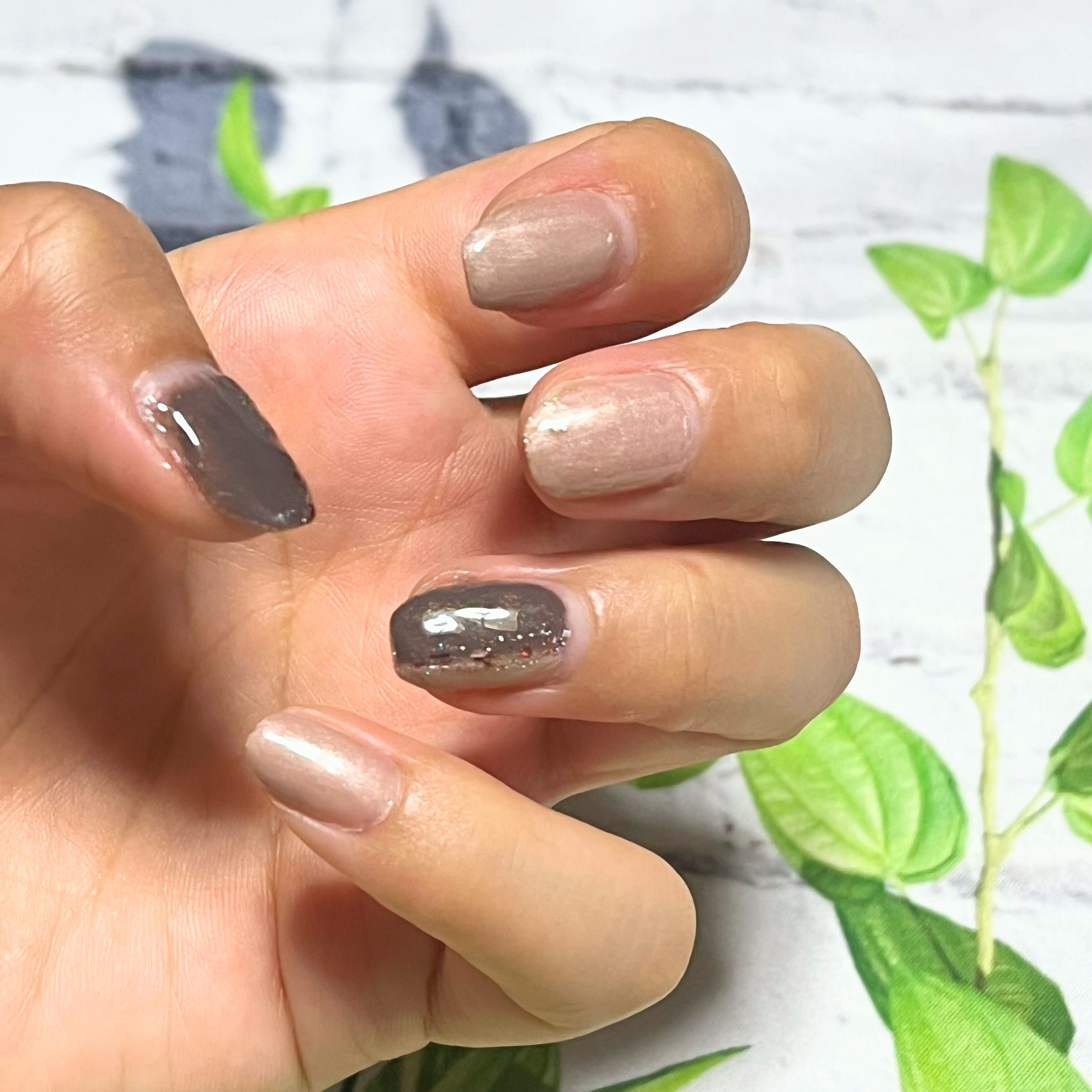 “Brown,butmakeitclassy.”DAISOのジェルネイル45マロンブラウン。100円とは思えないしっとり上品なツヤ。一度塗りだとカフェオレみたいな優しさ、二度塗りするとマロンケーキ級のこっくり感。指先に秋がふんわり宿る感じ🍂深...