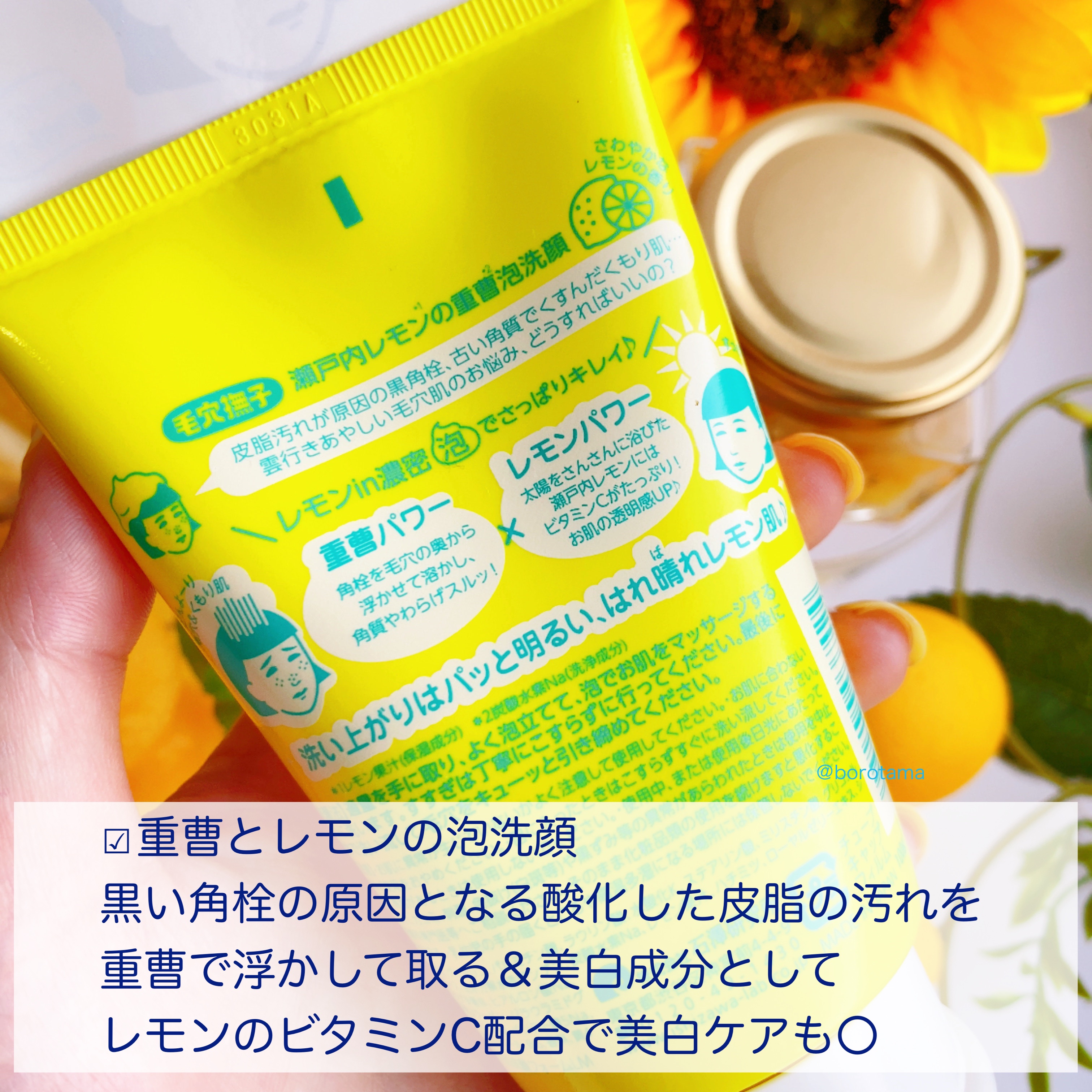 【使った商品】毛穴撫子 瀬戸内レモンの重曹泡洗顔【商品の特徴】どんより毛穴&くもり肌(※)も、瀬戸内レモンですっきり快晴!洗い上がりはパッと明るいはれ晴れレモン肌。太陽がさんさんと降り注ぐ広島県生口島の「せとだエコレモン」果汁を使用。ビタミン...