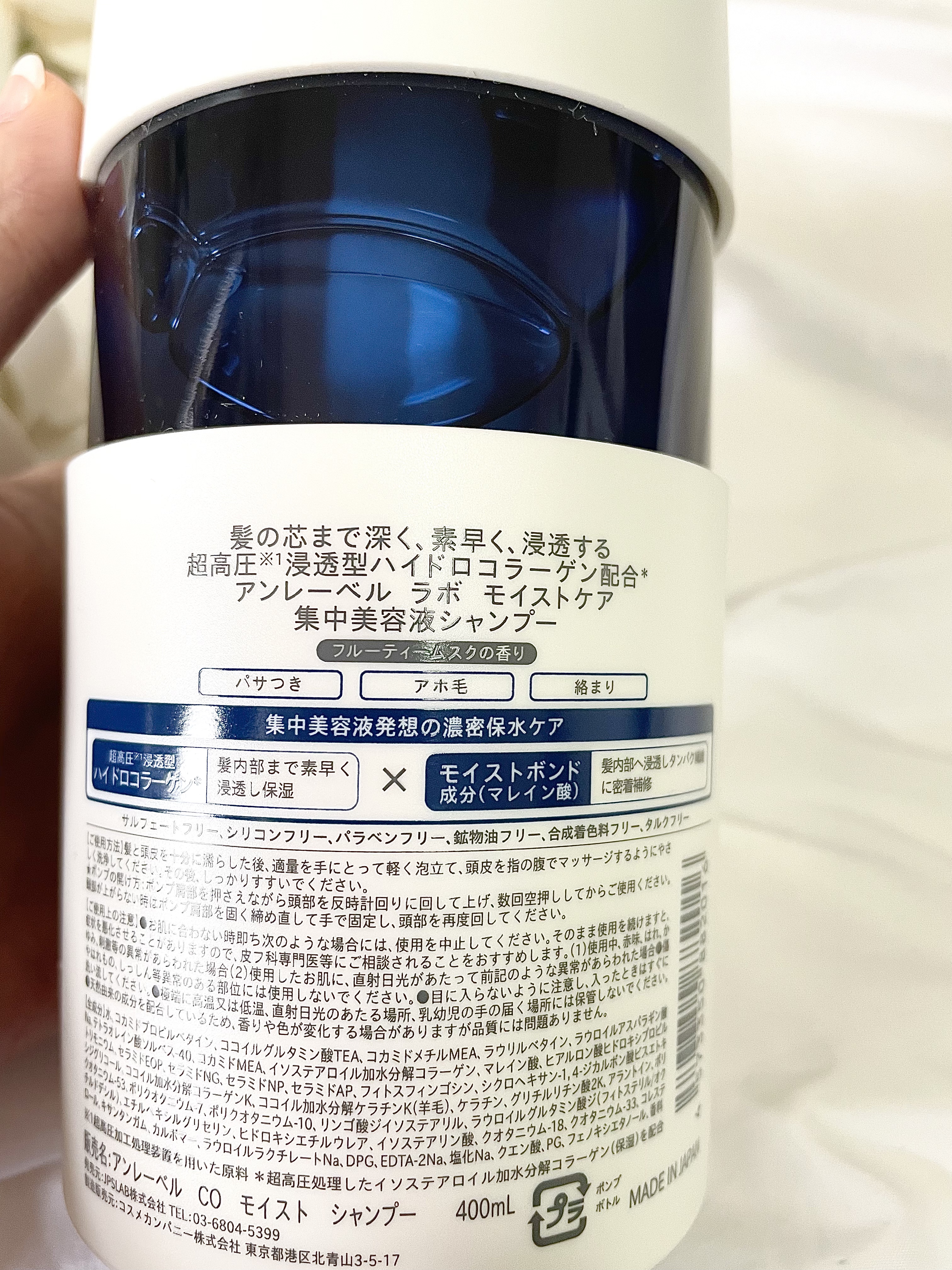 - <シャンプー 本体(400ml)> 水、コカミドプロピルベタイン、ココイルグルタミン酸TEA、コカミドメチルMEA、ラウリルベタイン、ラウロイルアスパラギン酸Na、テトラオレイン酸ソルベス-40、コカミドMEA、イソステアロイル加水分解コラーゲン、マレイン酸、ヒアルロン酸ヒドロキシプロピルトリモニウム、セラミドEOP、セラミドNG、セラミドNP、セラミドAP、フィトスフィンゴシン、シクロヘキサン-1,4-ジカルボン酸ビスエトキシジグリコール、ココイル加水分解コラーゲンK、ココイル加水分解ケラチンK(羊毛)、ケラチン、グリチルリチン酸2K、アラントイン、ポリクオタニウム-53、ポリクオタニウム-7、ポリクオタニウム-10、リンゴ酸ジイソステアリル、ラウロイルグルタミン酸ジ(フィトステリル/オクチルドデシル)、エチルヘキシルグリセリン、ヒドロキシエチルウレア、イソステアリン酸、クオタニウム-18、クオタニウム-33、コレステロール、キサンタンガム、カルボマー、ラウロイルラクチレートNa、DPG、EDTA-2Na、塩化Na、クエン酸、PG、フェノキシエタノール、香料 <ヘアトリートメント 本体(400ml)> 水、セタノール、ベヘントリモニウムクロリド、イソステアロイル加水分解コラーゲン、マレイン酸、ヒアルロン酸ヒドロキシプロピルトリモニウム、セラミドEOP、セラミドNG、セラミドNP、セラミドAP、フィトスフィンゴシン、シクロヘキサン-1,4-ジカルボン酸ビスエトキシジグリコール、エクトイン、スクワラン、ケラチン、オリーブ果実油、ホホバ種子油、マカデミア種子油、ローズヒップ油、エチルヘキシルグリセリン、アモジメチコン、ジメチコン、ジステアリルジモニウムクロリド、ダイマージリノール酸ダイマージリノレイルビス(ベヘニル/イソステアリル/フィトステリル)、リンゴ酸ジイソステアリル、ステアリン酸グリセリル、イソステアリン酸、クオタニウム-18、クオタニウム-33、ラウロイルラクチレートNa、コレステロール、キサンタンガム、カルボマー、クエン酸Na、クエン酸、PG、イソプロパノール、エタノール、フェノキシエタノール、香料 <シャンプー 詰め替え(310ml)> 水、コカミドプロピルベタイン、ココイルグルタミン酸TEA、コカミドメチルMEA、ラウリルベタイン、ラウロイルアスパラギン酸Na、テトラオレイン酸ソルベス-40、コカミドMEA、イソステアロイル加水分解コラーゲン、マレイン酸、ヒアルロン酸ヒドロキシプロピルトリモニウム、セラミドEOP、セラミドNG、セラミドNP、セラミドAP、フィトスフィンゴシン、シクロヘキサン-1,4-ジカルボン酸ビスエトキシジグリコール、ココイル加水分解コラーゲンK、ココイル加水分解ケラチンK(羊毛)、ケラチン、グリチルリチン酸2K、アラントイン、ポリクオタニウム-53、ポリクオタニウム-7、ポリクオタニウム-10、リンゴ酸ジイソステアリル、ラウロイルグルタミン酸ジ(フィトステリル/オクチルドデシル)、エチルヘキシルグリセリン、ヒドロキシエチルウレア、イソステアリン酸、クオタニウム-18、クオタニウム-33、コレステロール、キサンタンガム、カルボマー、ラウロイルラクチレートNa、DPG、EDTA-2Na、塩化Na、クエン酸、PG、フェノキシエタノール、香料 <ヘアトリートメント 詰め替え(310ml)> 水、セタノール、ベヘントリモニウムクロリド、イソステアロイル加水分解コラーゲン、マレイン酸、ヒアルロン酸ヒドロキシプロピルトリモニウム、セラミドEOP、セラミドNG、セラミドNP、セラミドAP、フィトスフィンゴシン、シクロヘキサン-1,4-ジカルボン酸ビスエトキシジグリコール、エクトイン、スクワラン、ケラチン、オリーブ果実油、ホホバ種子油、マカデミア種子油、ローズヒップ油、エチルヘキシルグリセリン、アモジメチコン、ジメチコン、ジステアリルジモニウムクロリド、ダイマージリノール酸ダイマージリノレイルビス(ベヘニル/イソステアリル/フィトステリル)、リンゴ酸ジイソステアリル、ステアリン酸グリセリル、イソステアリン酸、クオタニウム-18、クオタニウム-33、ラウロイルラクチレートNa、コレステロール、キサンタンガム、カルボマー、クエン酸Na、クエン酸、PG、イソプロパノール、エタノール、フェノキシエタノール、香料 <シャンプー 詰め替え1.9倍> 水、コカミドプロピルベタイン、ココイルグルタミン酸TEA、コカミドメチルMEA、ラウリルベタイン、ラウロイルアスパラギン酸Na、テトラオレイン酸ソルベス-40、コカミドMEA、イソステアロイル加水分解コラーゲン、マレイン酸、ヒアルロン酸ヒドロキシプロピルトリモニウム、セラミドEOP、セラミドNG、セラミドNP、セラミドAP、フィトスフィンゴシン、シクロヘキサン-1,4-ジカルボン酸ビスエトキシジグリコール、ココイル加水分解コラーゲンK、ココイル加水分解ケラチンK(羊毛)、ケラチン、グリチルリチン酸2K、アラントイン、ポリクオタニウム-53、ポリクオタニウム-7、ポリクオタニウム-10、リンゴ酸ジイソステアリル、ラウロイルグルタミン酸ジ(フィトステリル/オクチルド