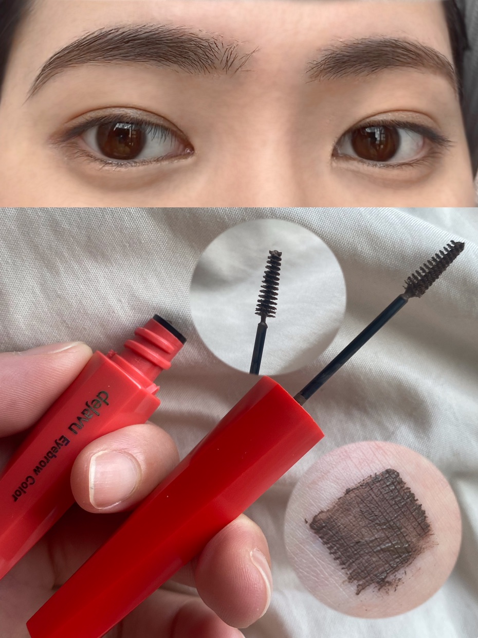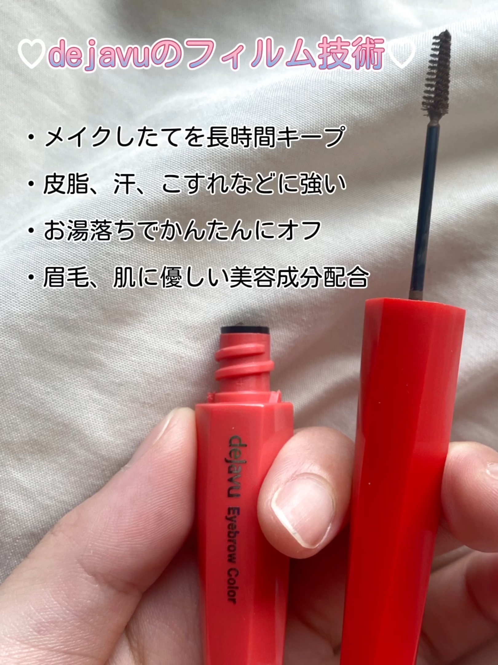 1本1本色づき固まらない「フィルム眉カラー」 塗りやすい極小ブラシで簡単垢抜け✨ デジャヴュ独自の薄膜フィルムを採用。 毛がパリッと固まらず、タバやダマのないふんわり自然な眉に。 フィルムタイプで速乾性が高く、皮脂・汗・こすれに強いのに、お湯だけで簡単に落とせます✨