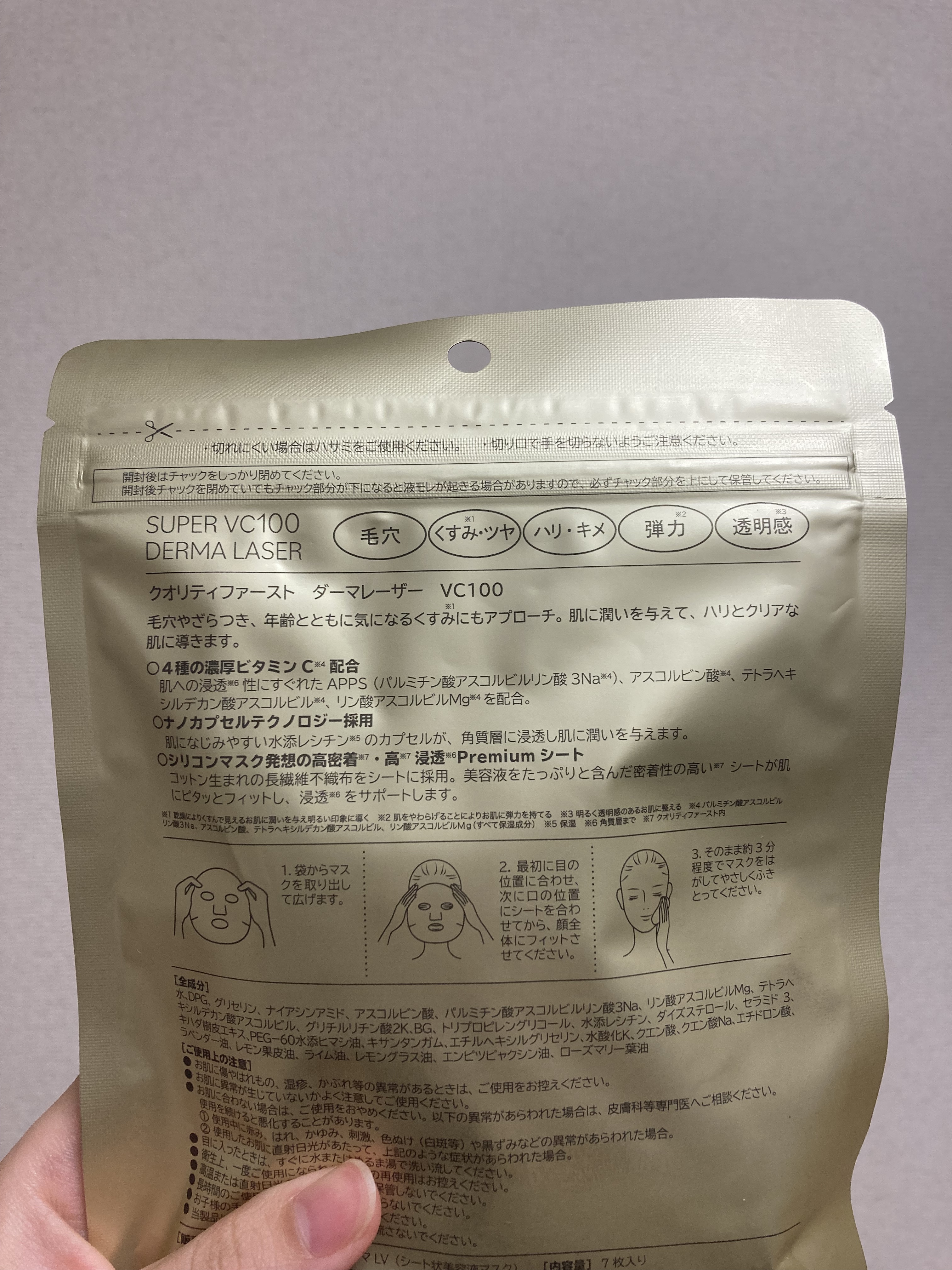 クオリティファーストダーマレーザースーパーVC100マスク美的の付録でついてきたやつを使ってます以前にVC100エクソソームのタイプを使っていてかなり似てるけどメインの成分みてみると全然ちがったなんとなく見た成分の感じだとエクソソームの方が好...