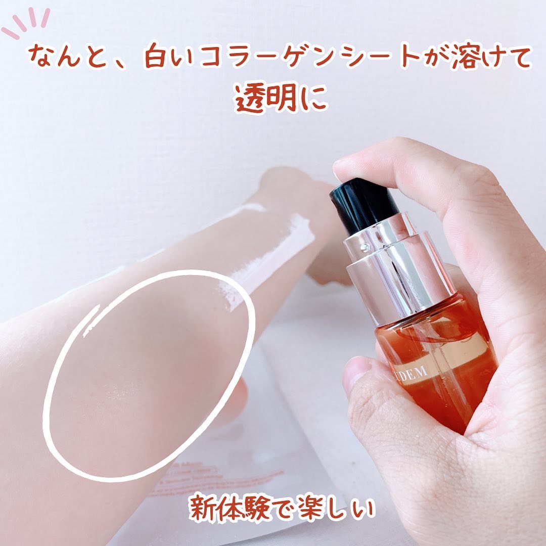 フィルムそのものがコラーゲンで作られたマスクと、 生ビタミンCが贅沢に配合されたミストが セットになった、新しいフェイスマスク🤲🏻💭 お肌に貼り付けると一瞬で溶けるように 馴染んでいって初めての感覚にびっくり😳💗 これが最先端のテクノロジーで作られた 新感覚のスキンケア体験なんだ!すごい👏🏻 夜のスキンケアでこのマスクを顔に貼って寝て、 朝起きると、ハリが出てもちもちしていて、 いつものお肌と違ったし生き返った感じ☺️💓 スペシャルケアにぴったりです❣️
